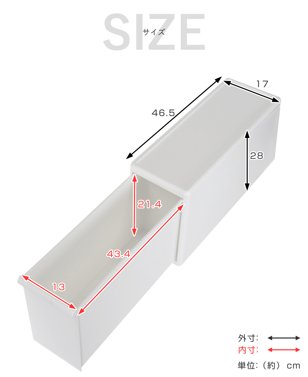 | サイズ | 約 幅17×奥行46.5×高さ28(cm) 引出し内寸:約 幅13×奥行43.4×高さ21.4(cm) |