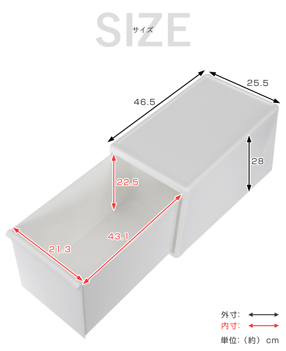 | サイズ | 約 幅25.5×奥行46.5×高さ28(cm) 引出し内寸:約 幅21.3×奥行43.1×高さ22.5(cm) |