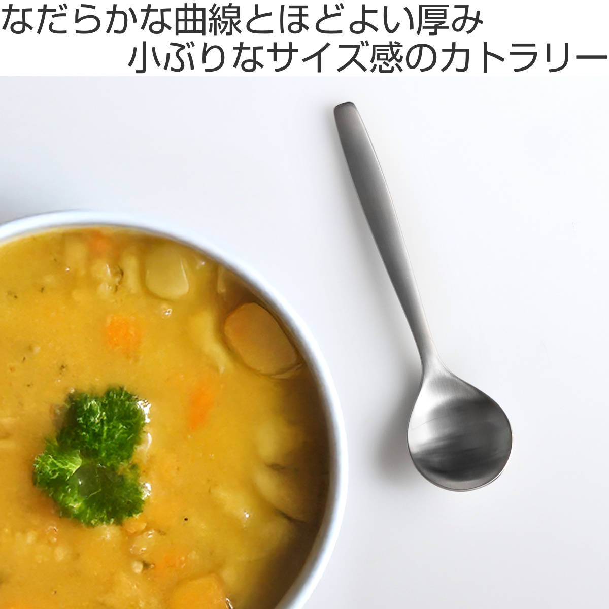 こちらのスープスプーンは、幅広で深さがあり、具沢山のスープやシチューなどもすくいやすいです。16cmのデザートフォークと合わせれば、ディナー用よりも少し小さめのサイズ感なので、手の小さな女性やお子様にもおすすめです。