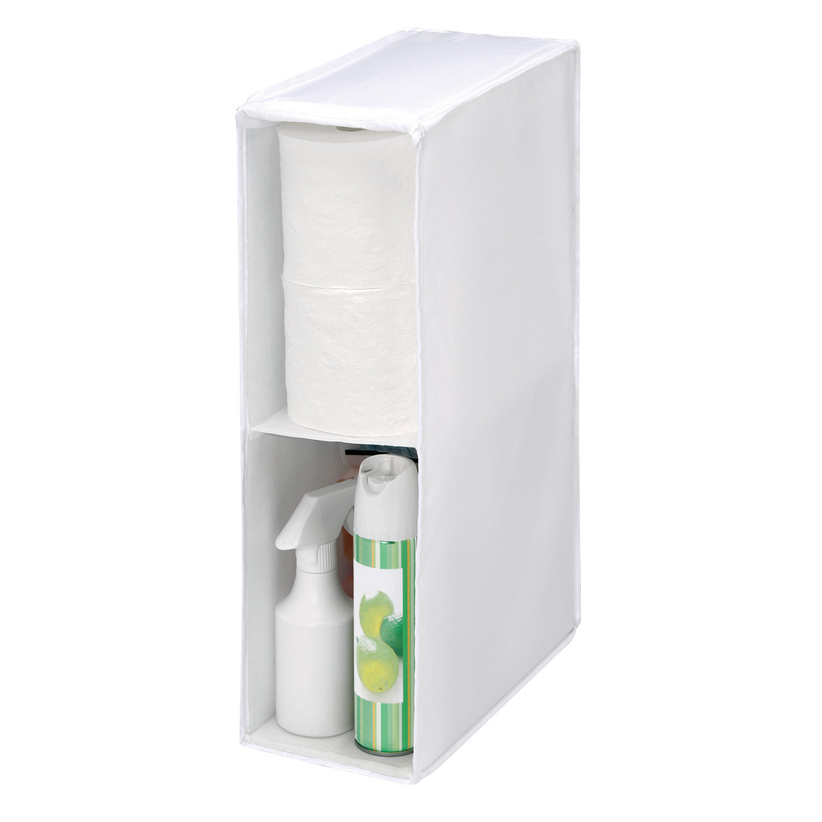 ●2段タイプなので、トイレットペーパーやサニタリー用品・消臭スプレー・洗剤などわけてスッキリ収納できます。
