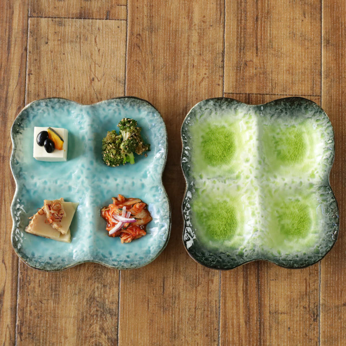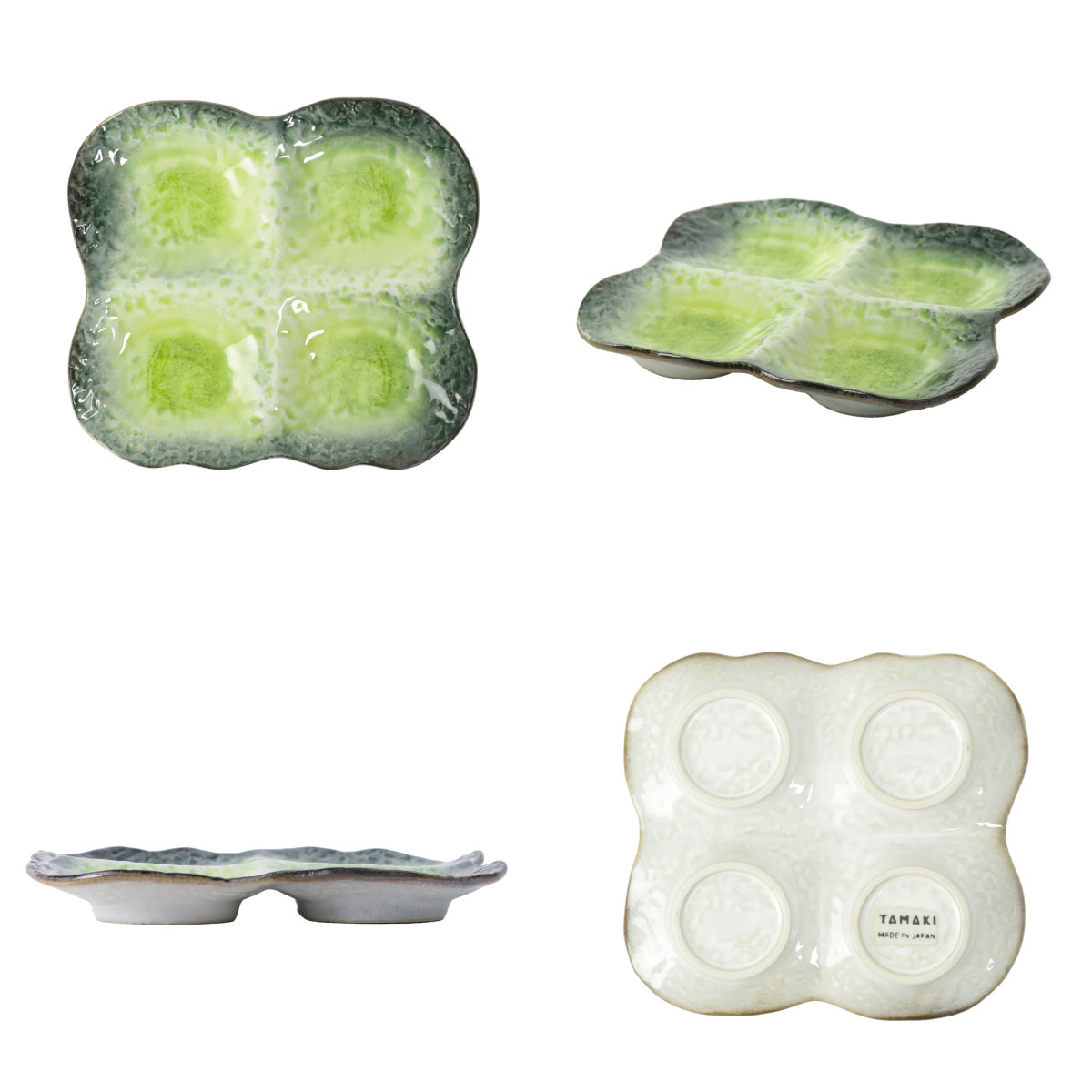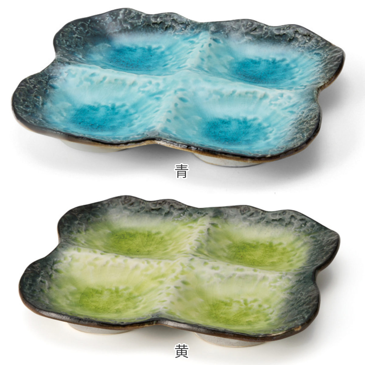 薬味や香物、小鉢四種盛りやビュッフェの取り分け皿などにぴったりな4連の小皿です。釉薬の溜まりに味わいを感じ、器の鮮やかな色彩が食材を引き立ててくれます。