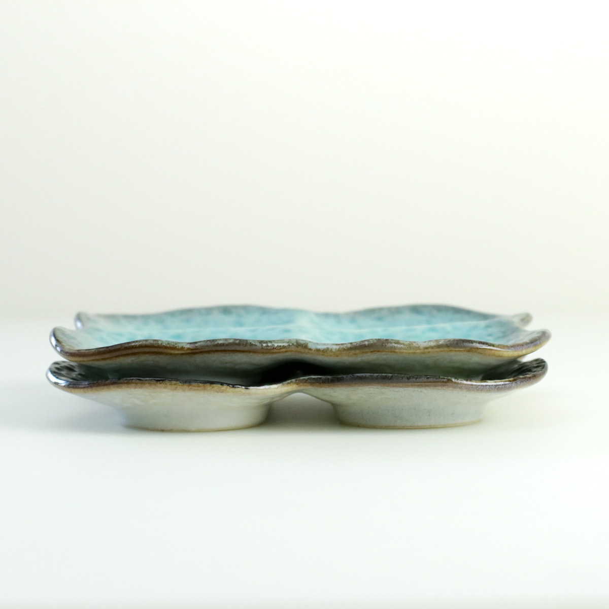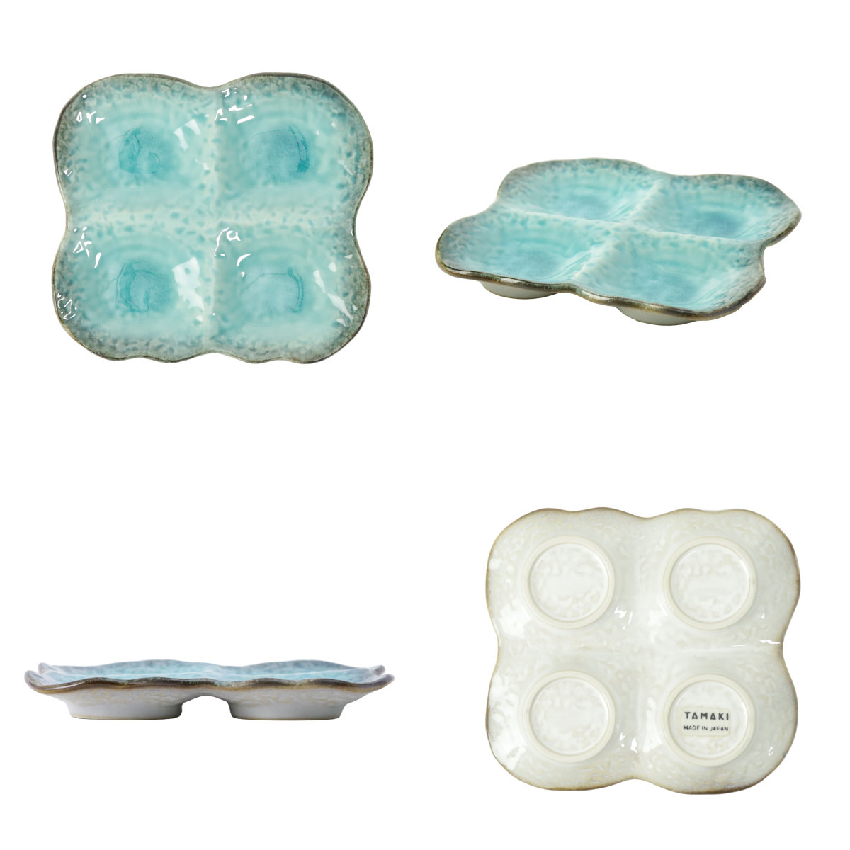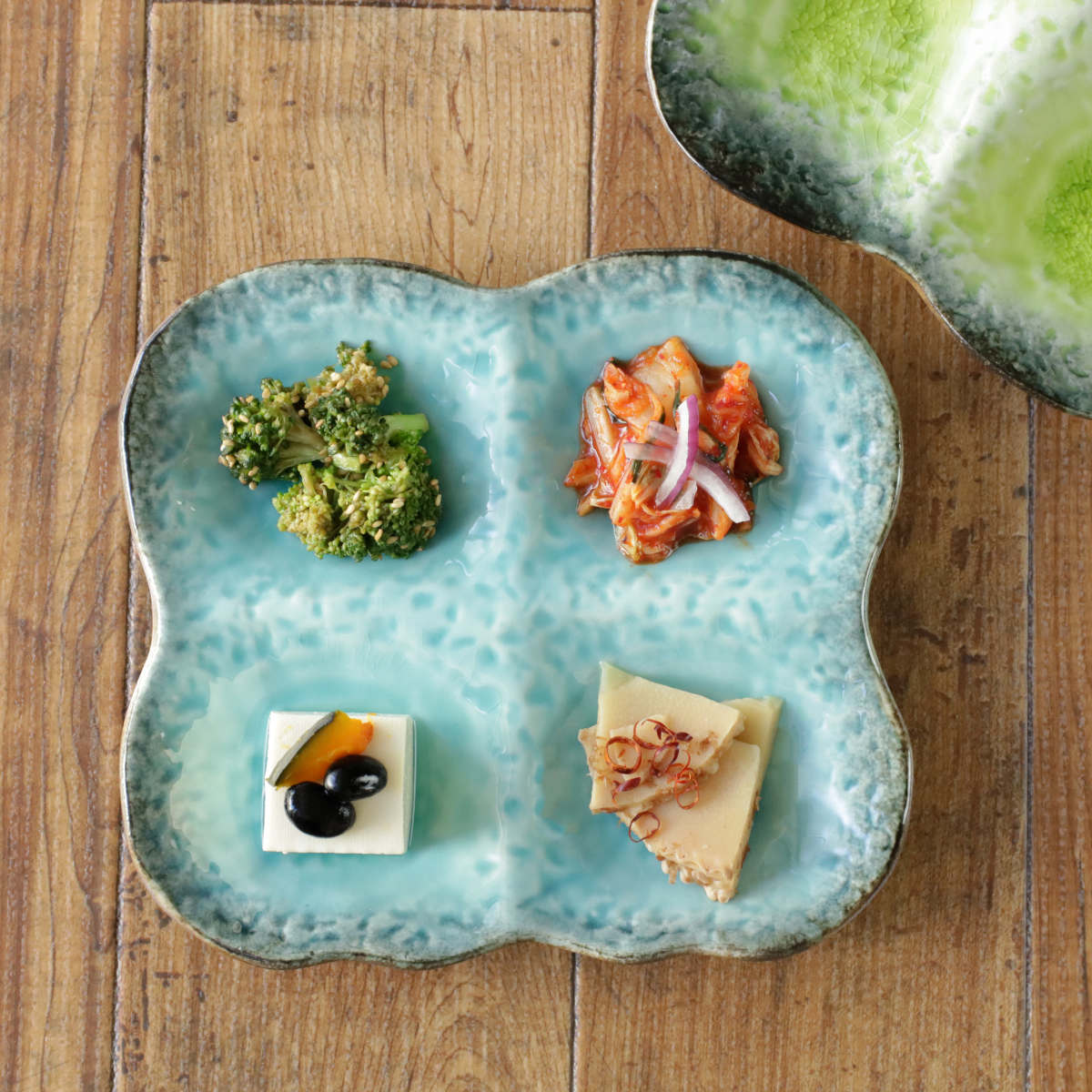 薬味や香物、小鉢四種盛りやビュッフェの取り分け皿などにぴったりな4連の小皿です。釉薬の溜まりに味わいを感じ、器の鮮やかな色彩が食材を引き立ててくれます。