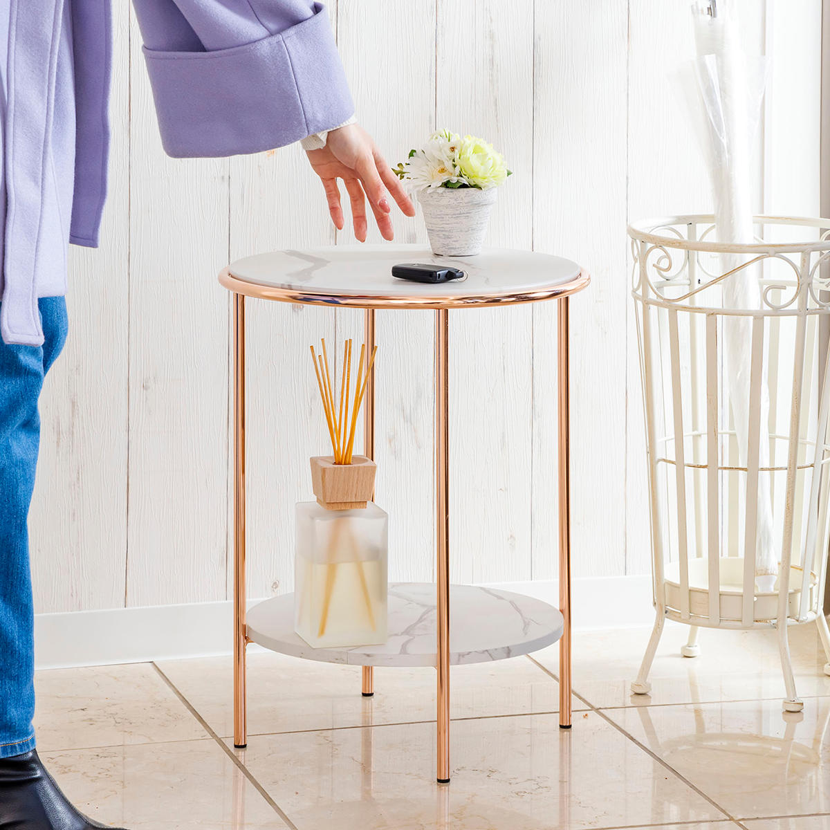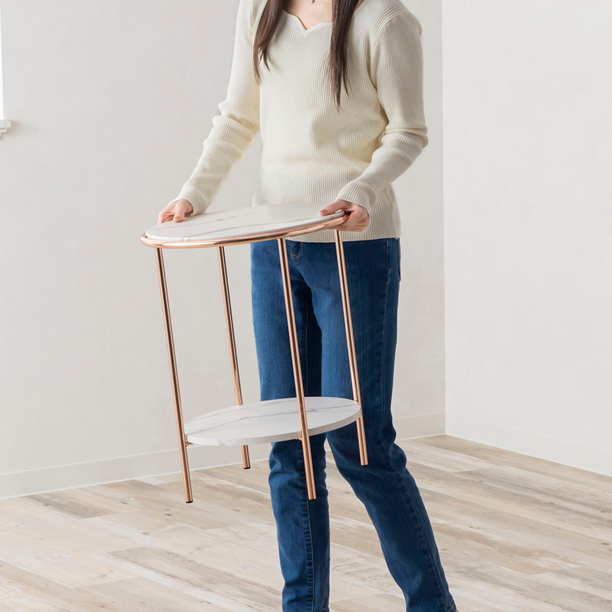 オープンフレームで圧迫感がありませんので、ベッド横やソファ横のサイドテーブルとしてはもちろん、玄関にもおすすめです。