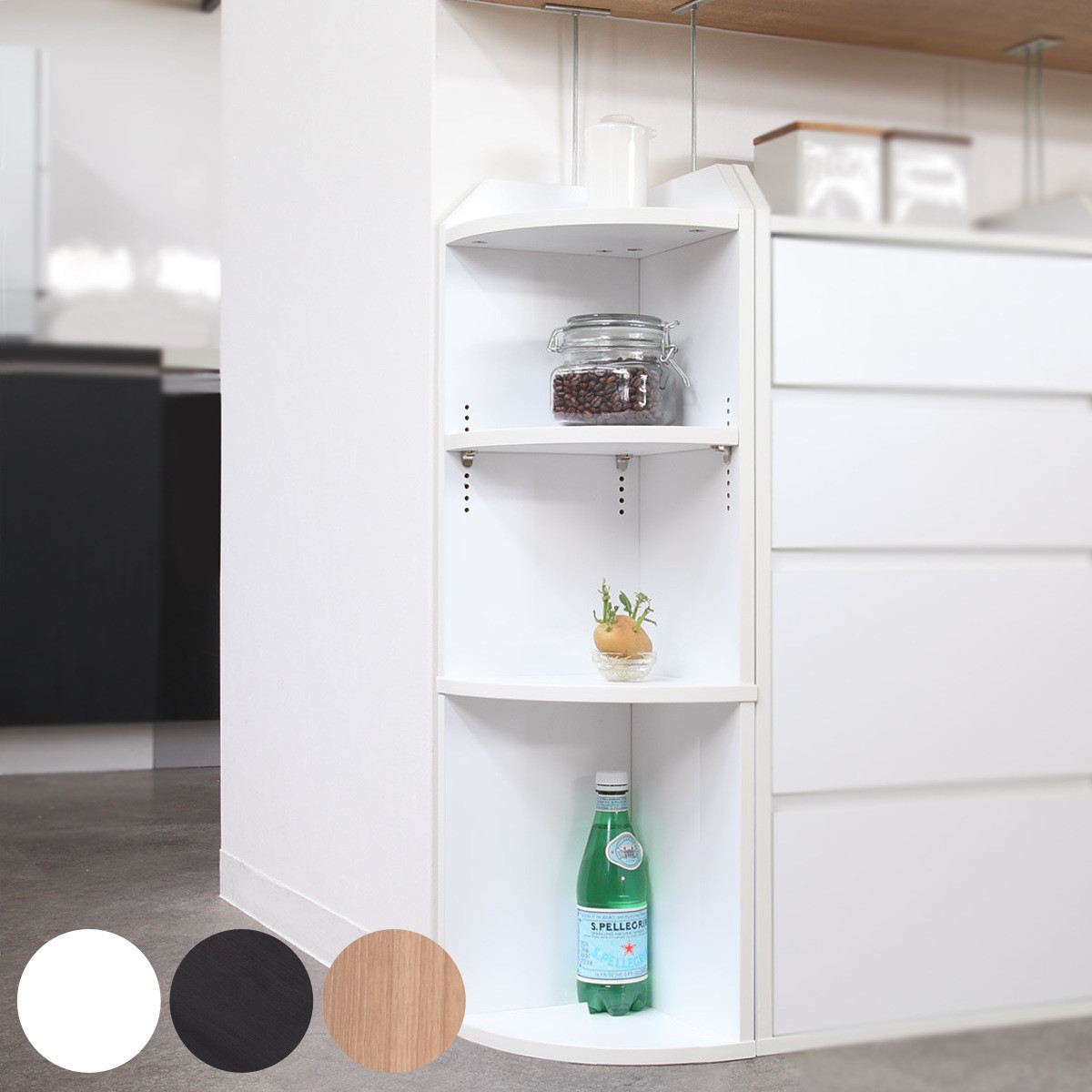 キッチンのカウンター下スペースを有効活用できる収納家具シリーズのコーナーラックです。キッチンやダイニングはもちろん、突っ張り金具を取り外せば、リビングや書斎など場所を選ばず活躍します。たっぷり収納できるのに奥行は約22cmと薄型なので、お部屋をスッキリと片付けることができます。
