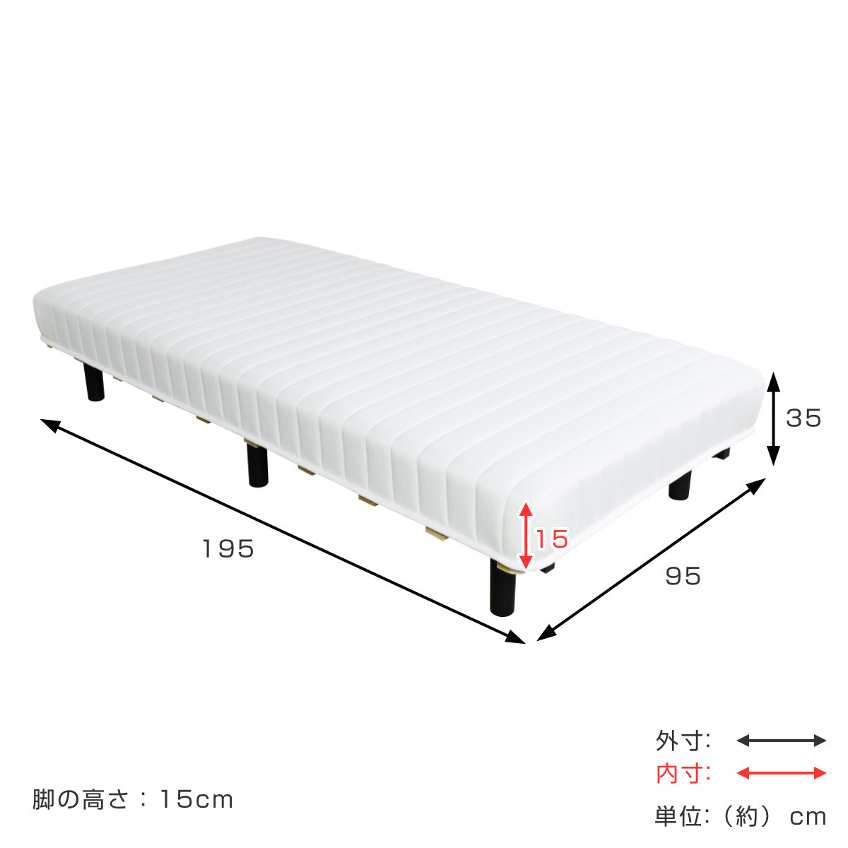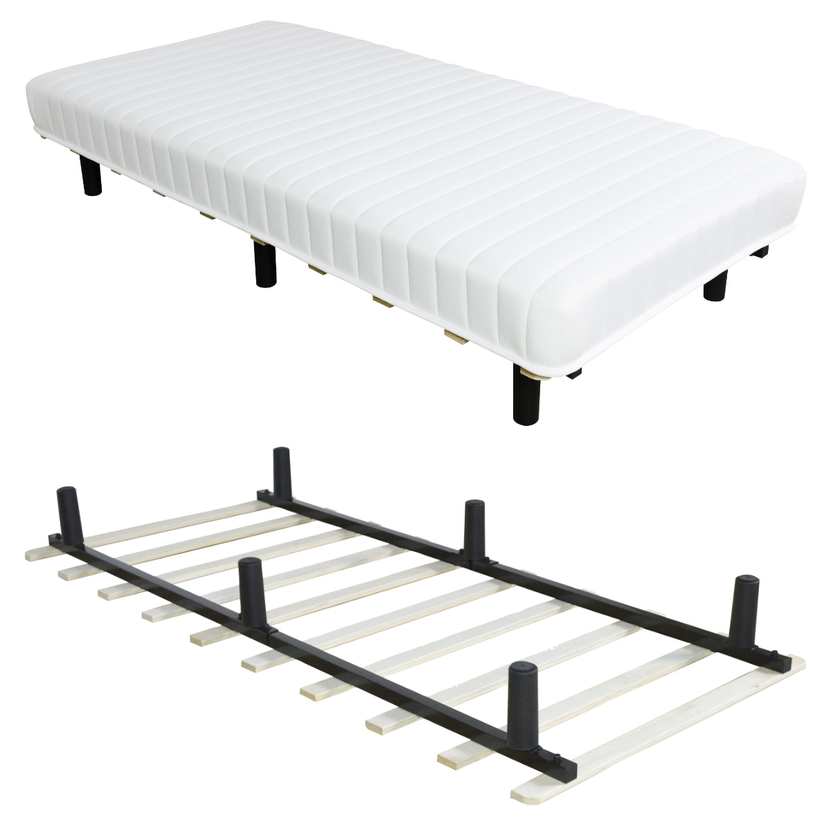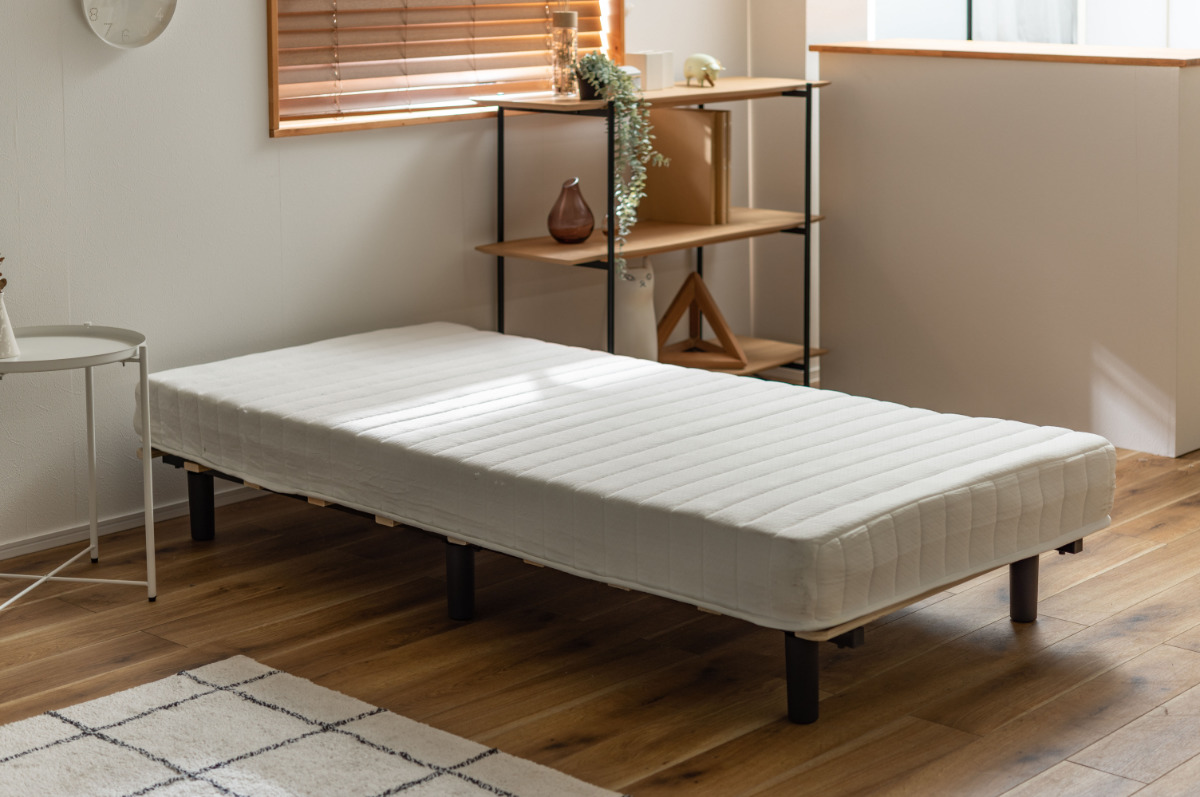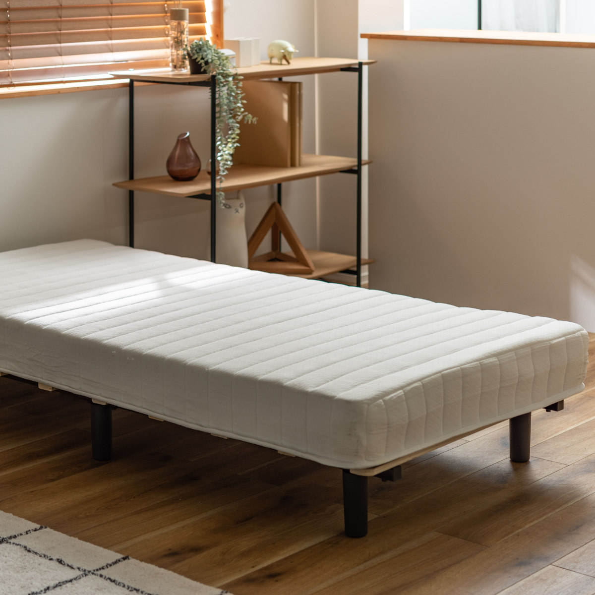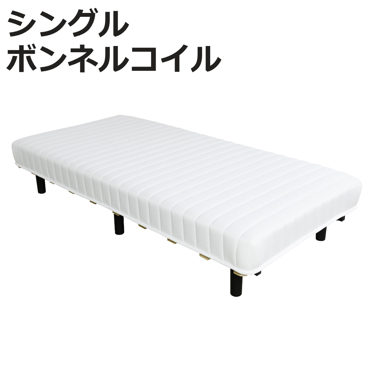 ボンネルコイルベッド マットレス付き シングルスタイリッシュなデザインのマットレス付きベッドです。マットレス下部は通気性抜群のすのこ板で、汗や湿気を溜め込まず、年中快適におやすみいただけます。シンプルなデザインなので、どんなお部屋にもフィットする使いやすいベッドです。