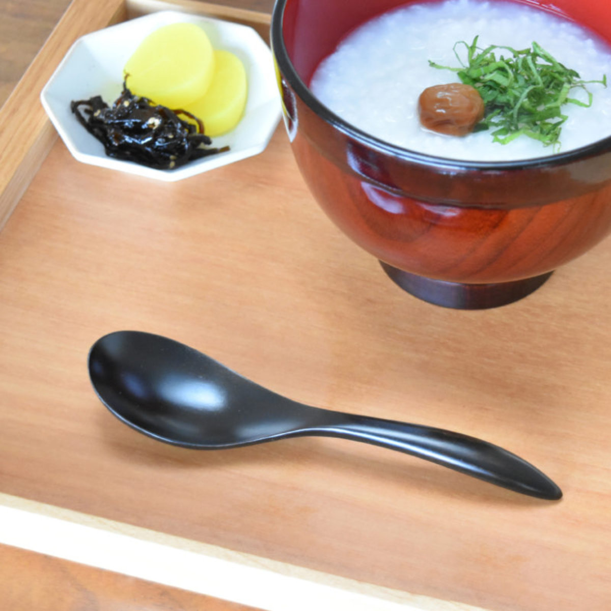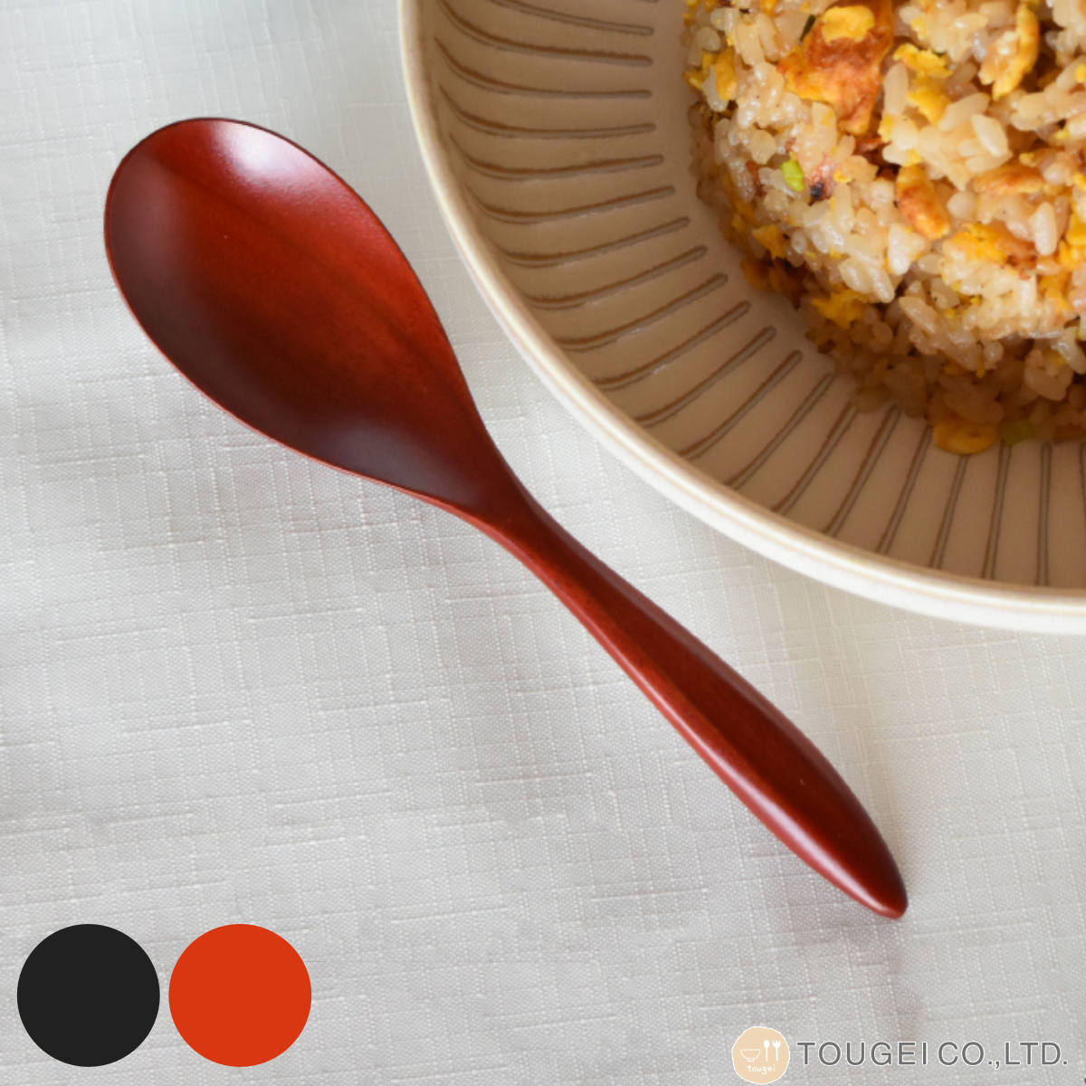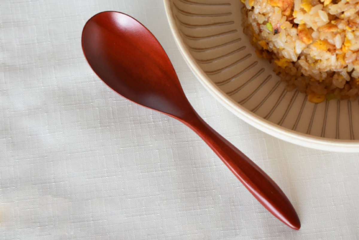カタチにこだわった漆塗りの木製レンゲスプーンのツボ(すくう部分)と柄の境目の無いなめらかなフォルムは、スプーンのさし心地、口から抜く際の口離れ、持ちやすさのバランスが考え抜かれた形状です。絶妙なカーブで汁物やチャーハン、おかゆなどと食べる時ににおすすめです。