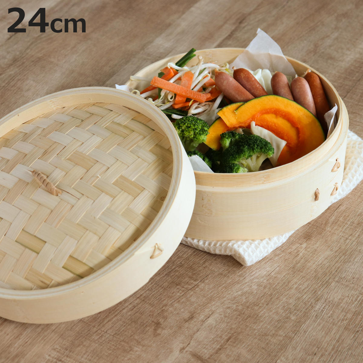 3〜4人にぴったりサイズ 24cm中華まん4個が入るぐらいの大きめなサイズ感です。魚やお肉と野菜を一緒に入れやすいのでメインの料理におすすめです。また、おこわやおかずの温め直しにも使いやすいです。