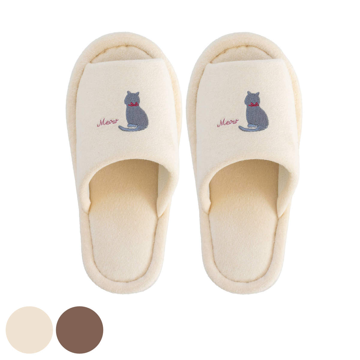 「ミニョン」シリーズのトイレスリッパです。かわいらしいねこと、「ミャウ」という鳴き声の刺繍が施されており、楽しいデザインになっています。トイレはもちろん、お部屋用や来客用としてもお使いいただけます。