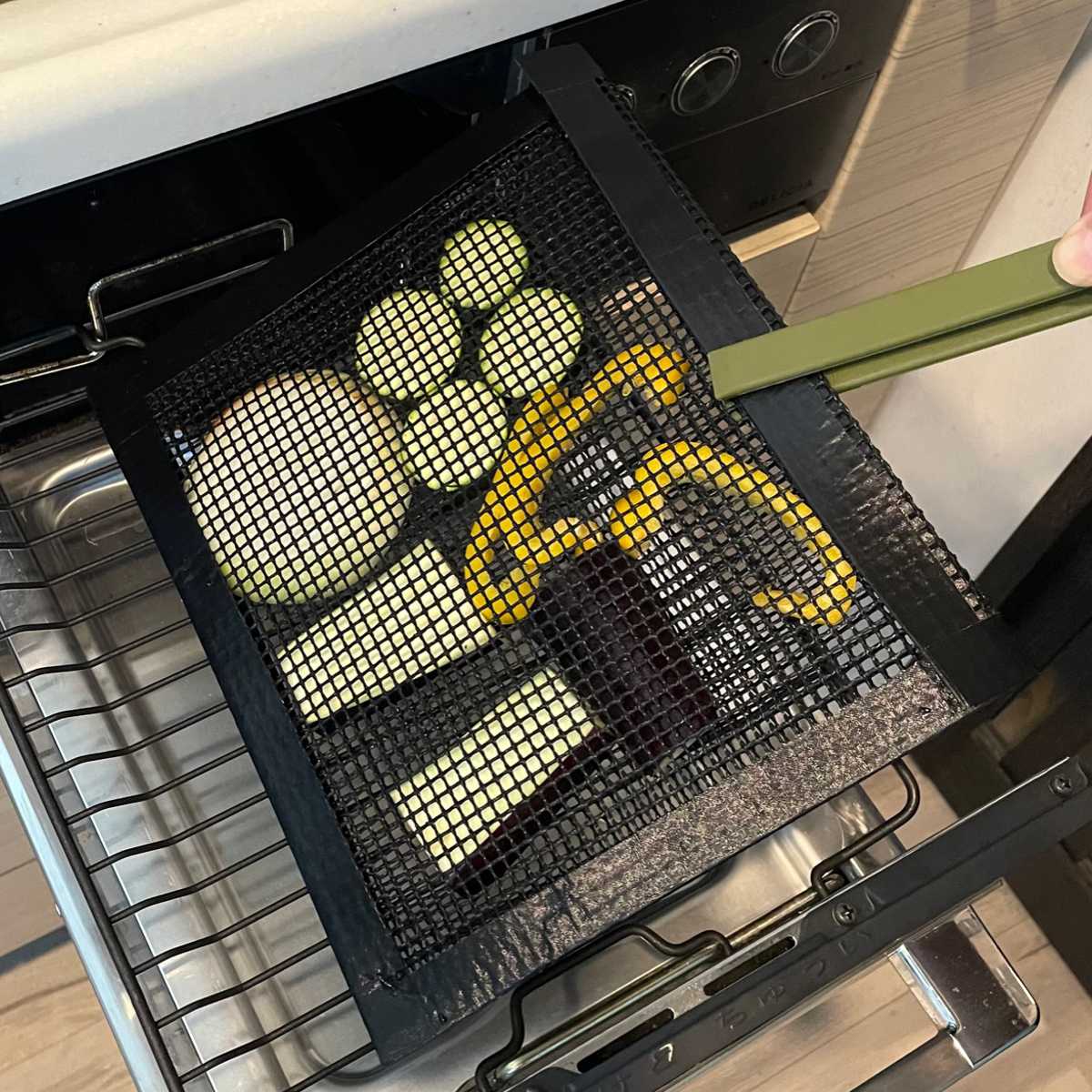 食材をまとめてひっくり返せるグリルBBQバッグメッシュ状のバッグに食材を入れて、そのまま焼けるアイテムです。食材を一気にひっくり返せて便利です。