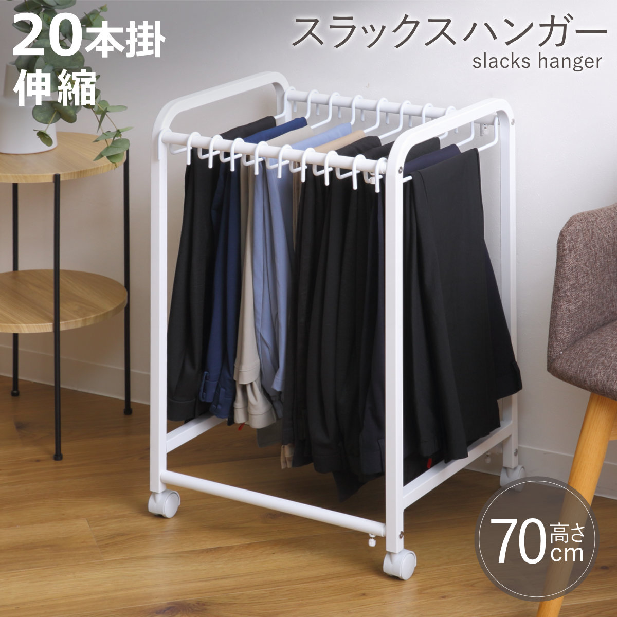 スラックスハンガー 伸縮式 キャスター付き 20本掛け 幅48.5〜76.5×奥行42.5×高さ70cm ( ズボンハンガー パンツハンガー スリム 伸縮 クローゼット収納 )