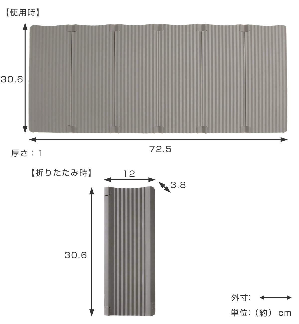 | サイズ | 約 幅72.5×奥行1×高さ30.6(cm) 折りたたみ時:約 幅12×奥行3.8×高さ30.6(cm) |