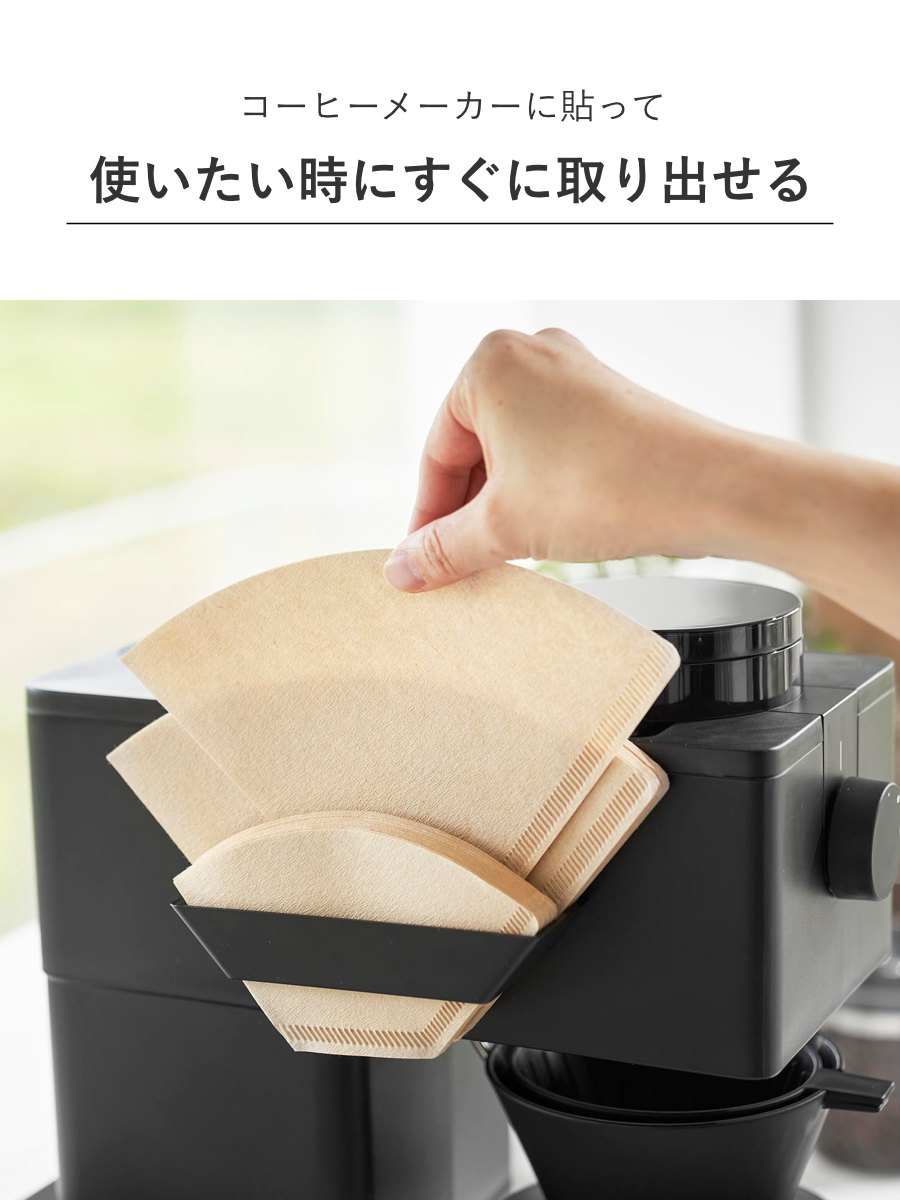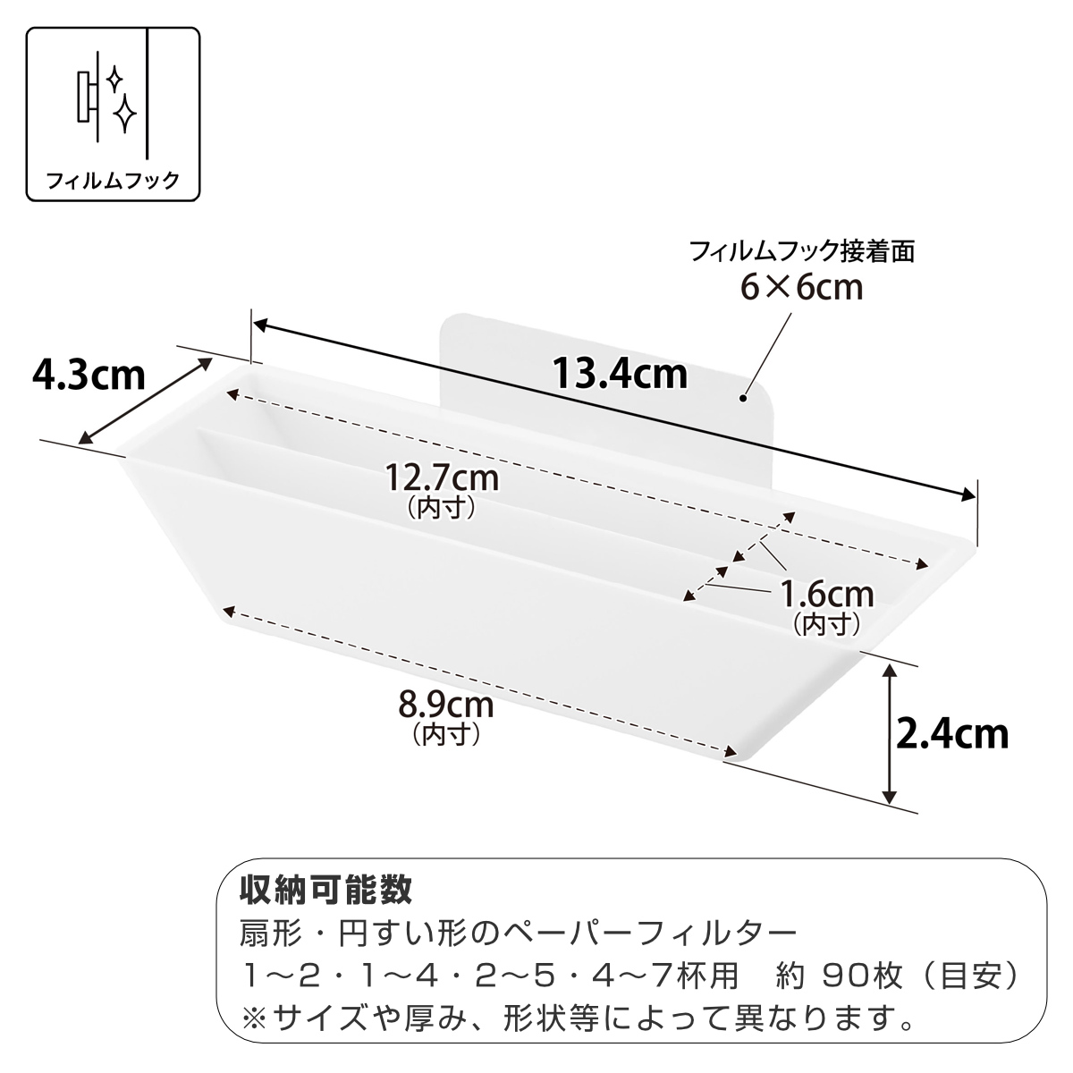 | 備考 | 【収納可能数】 扇形・円すい形のペーパーフィルター 1〜2・1〜4・2〜5・4〜7杯用 約 90枚(目安) ※サイズや厚み、形状等によって異なります。 【使用できる面】 光沢のある平らな油染みしない面で、フィルムフックの接着面よりも大きい面(タイル・プラスチック・ステンレス・ガラス・金属塗装面・人工大理石) |