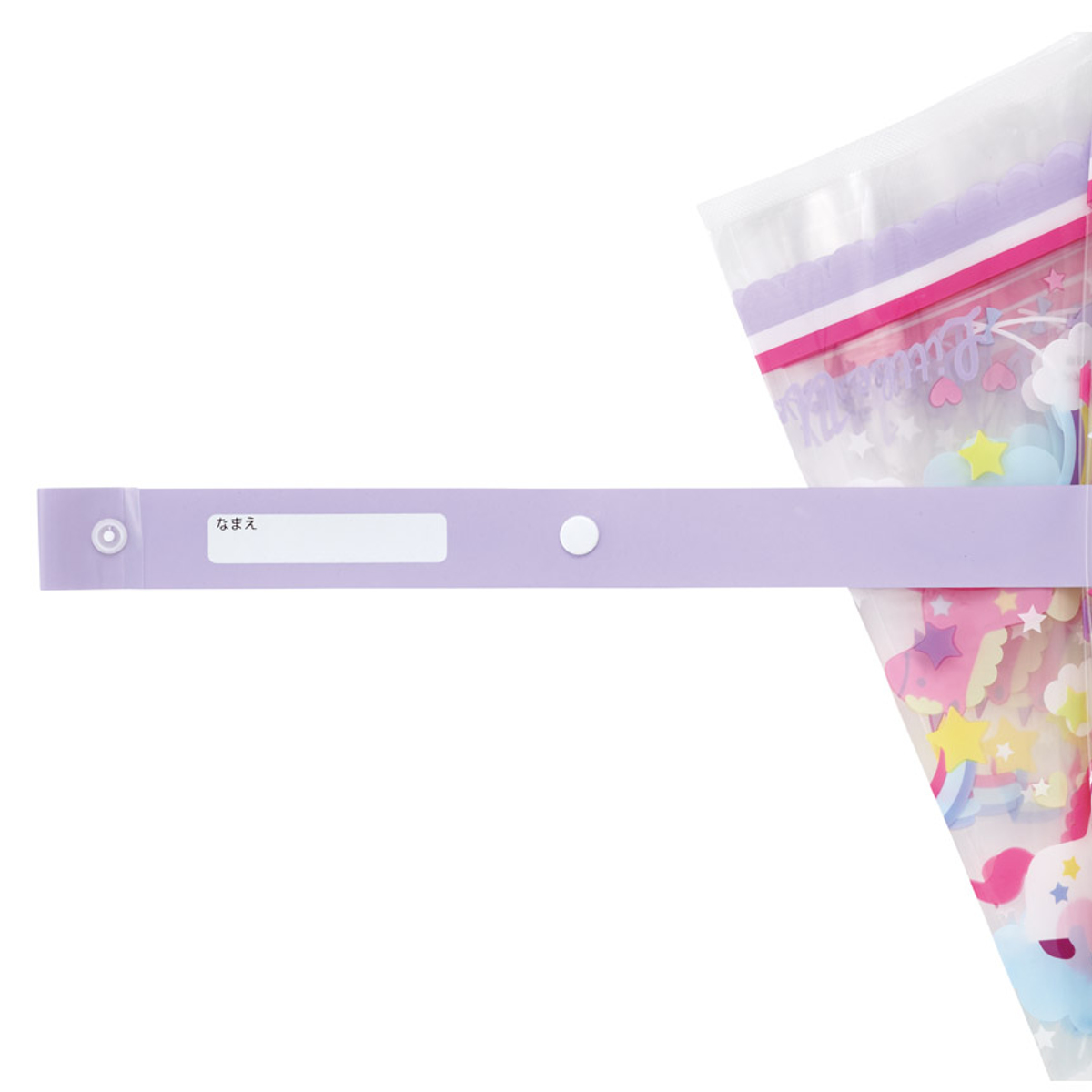 ネームタグ付き傘をまとめるベルトには、名前が書けるスペースがあります。名前があると、傘を持っていく時や置き傘をした時に分かりやすく間違えにくいです。