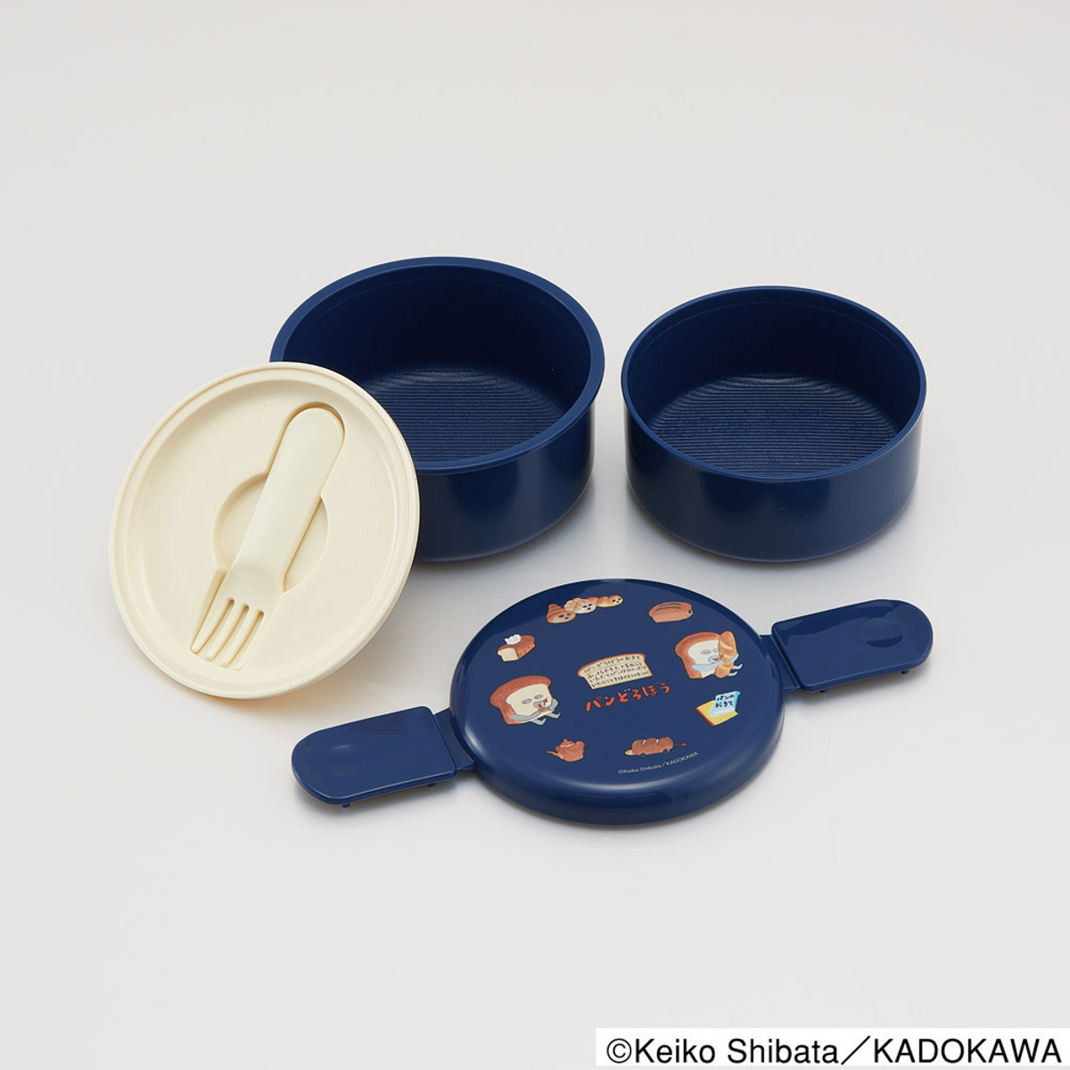 便利なミニフォーク付き、丸型ランチボックス丸型のかわいい2段タイプのランチボックスです。プラスチック製のミニフォーク付きで別でカトラリーを持ち歩かなくても大丈夫です。食べ終わった後は、下段に上段を収納できる入れ子式で、コンパクトに持ち帰ることができます。
