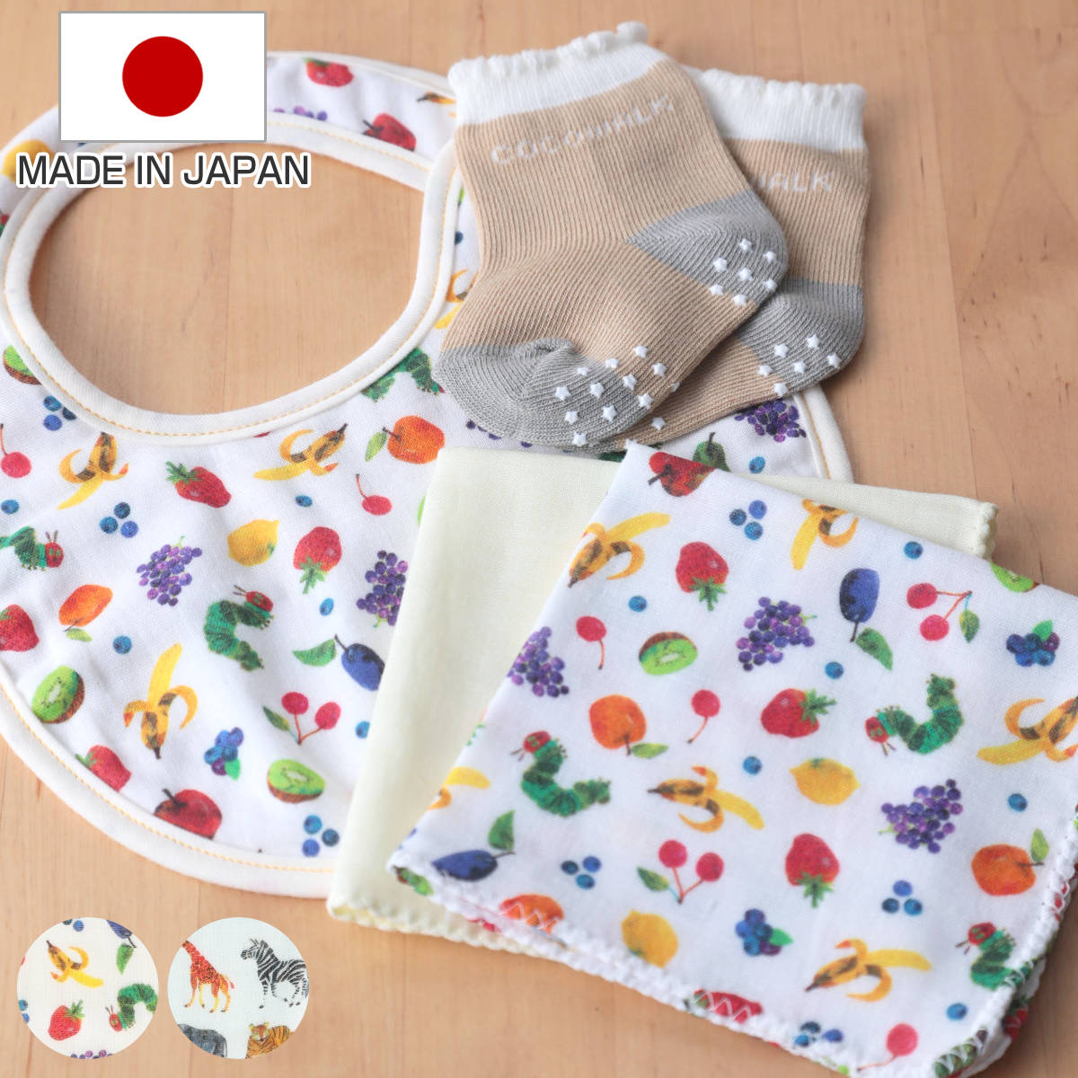 出産のお祝いにぴったり、はらぺこあおむしの可愛いギフトセット●人気絵本「はらぺこあおむし」のデザインが可愛いスタイとハンカチ2枚、ソックスが入ったギフトセットです。