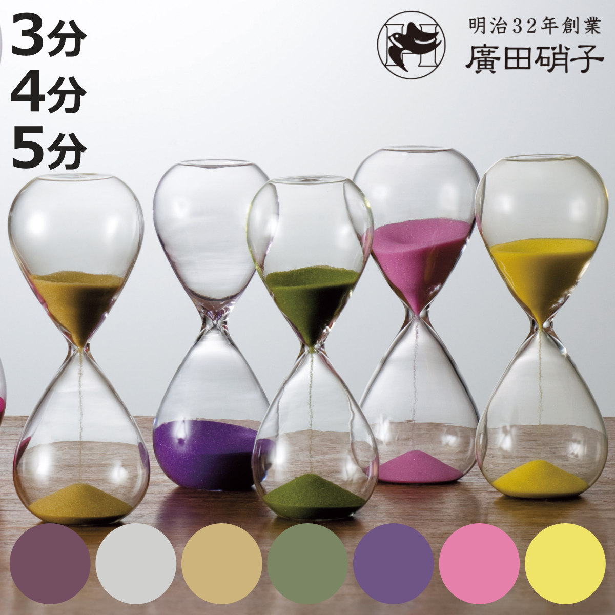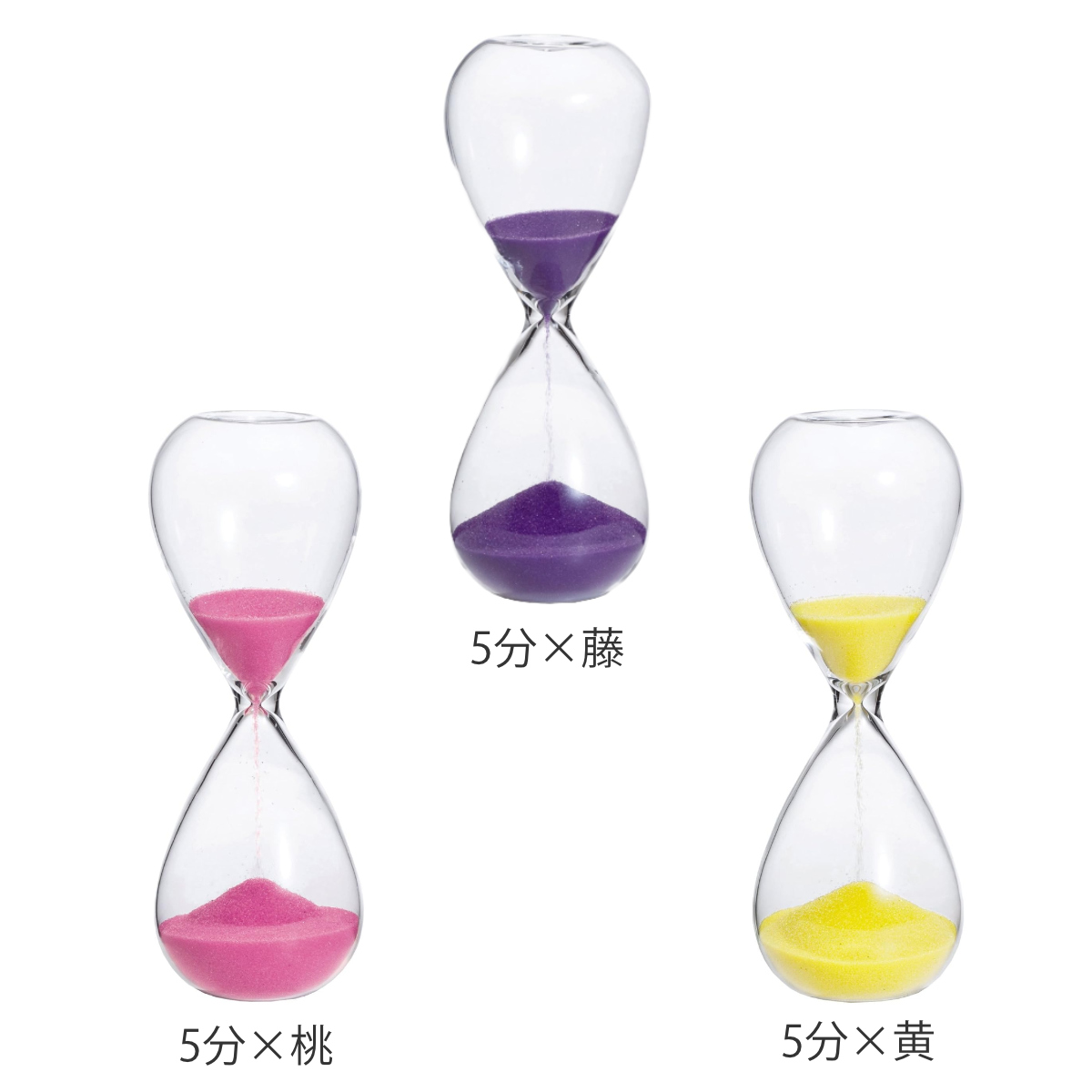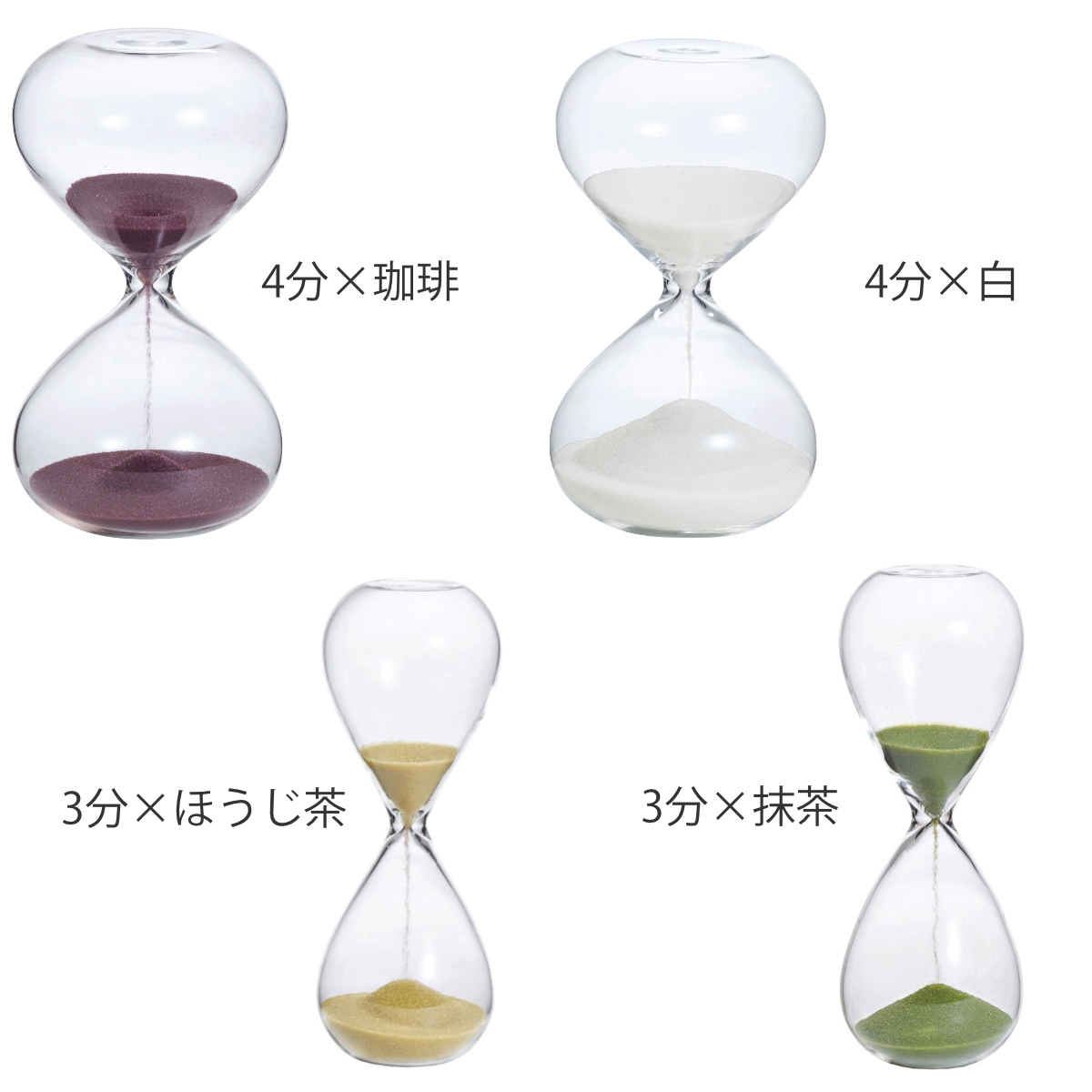 約3分と約4分と約5分が測れるほうじ茶・抹茶は約3分、珈琲・白は約4分、藤・桃・黄は約5分計測できます。
