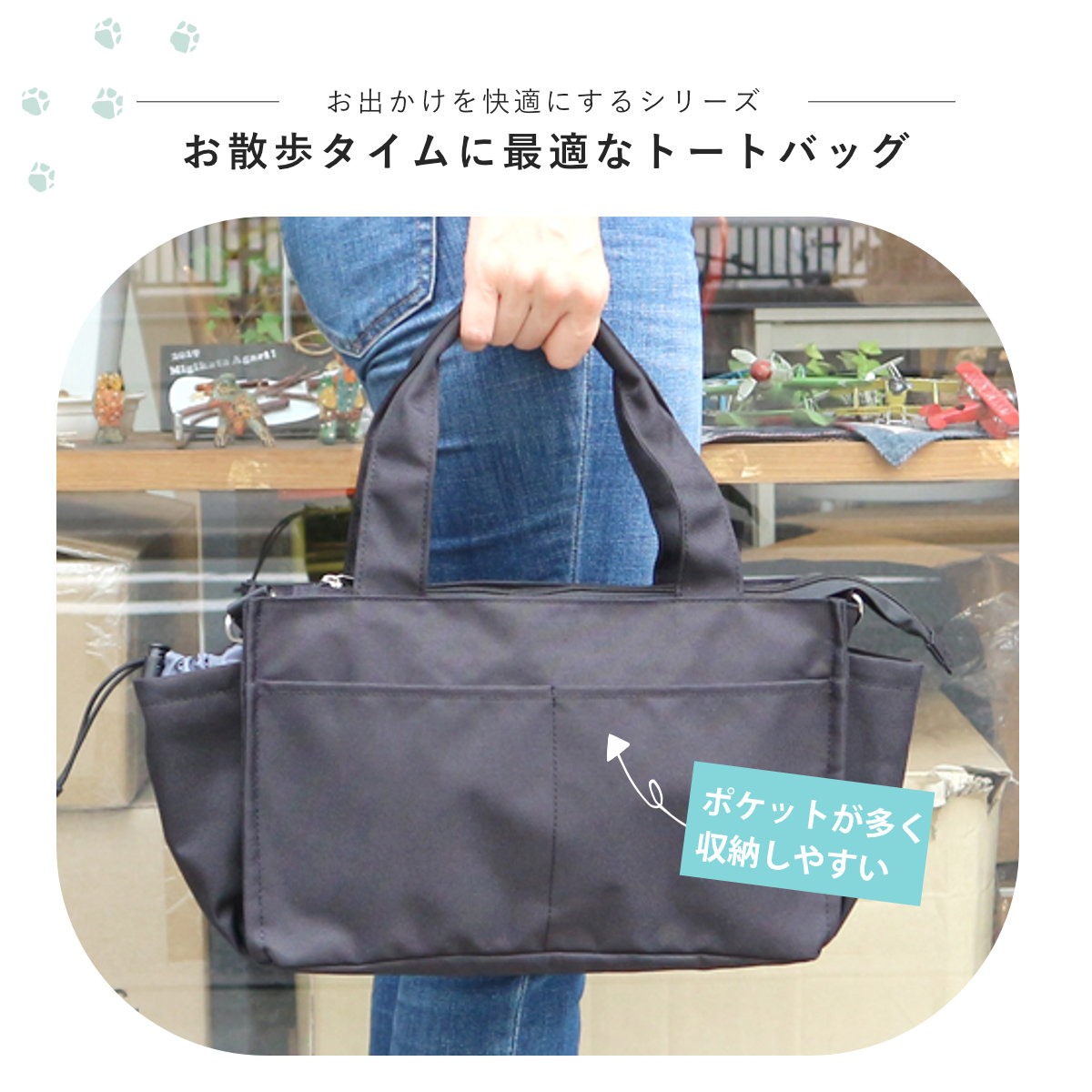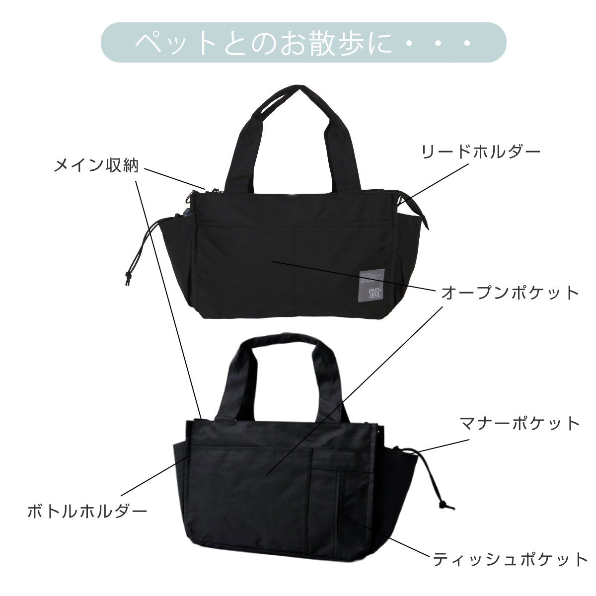 ●ペットボトルなどお散歩に必要なグッズが収納しやすいデザインのバッグです。