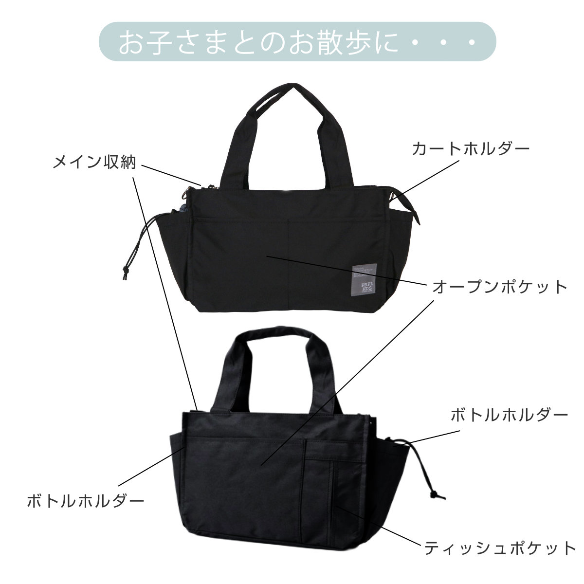●ボトルホルダー、マナーポケット、オープンポケット、ティッシュポケット、リードホルダー等の機能が付いています。