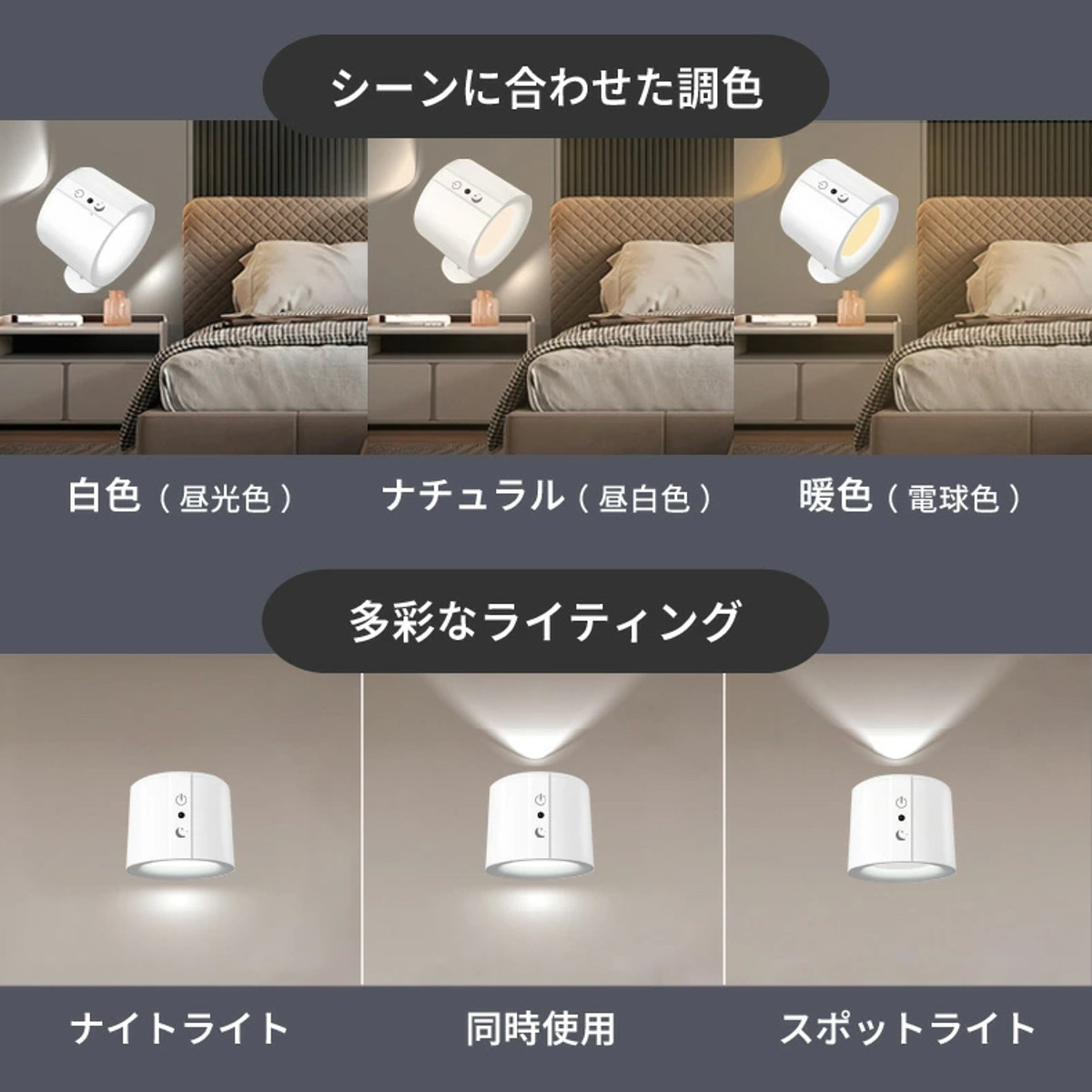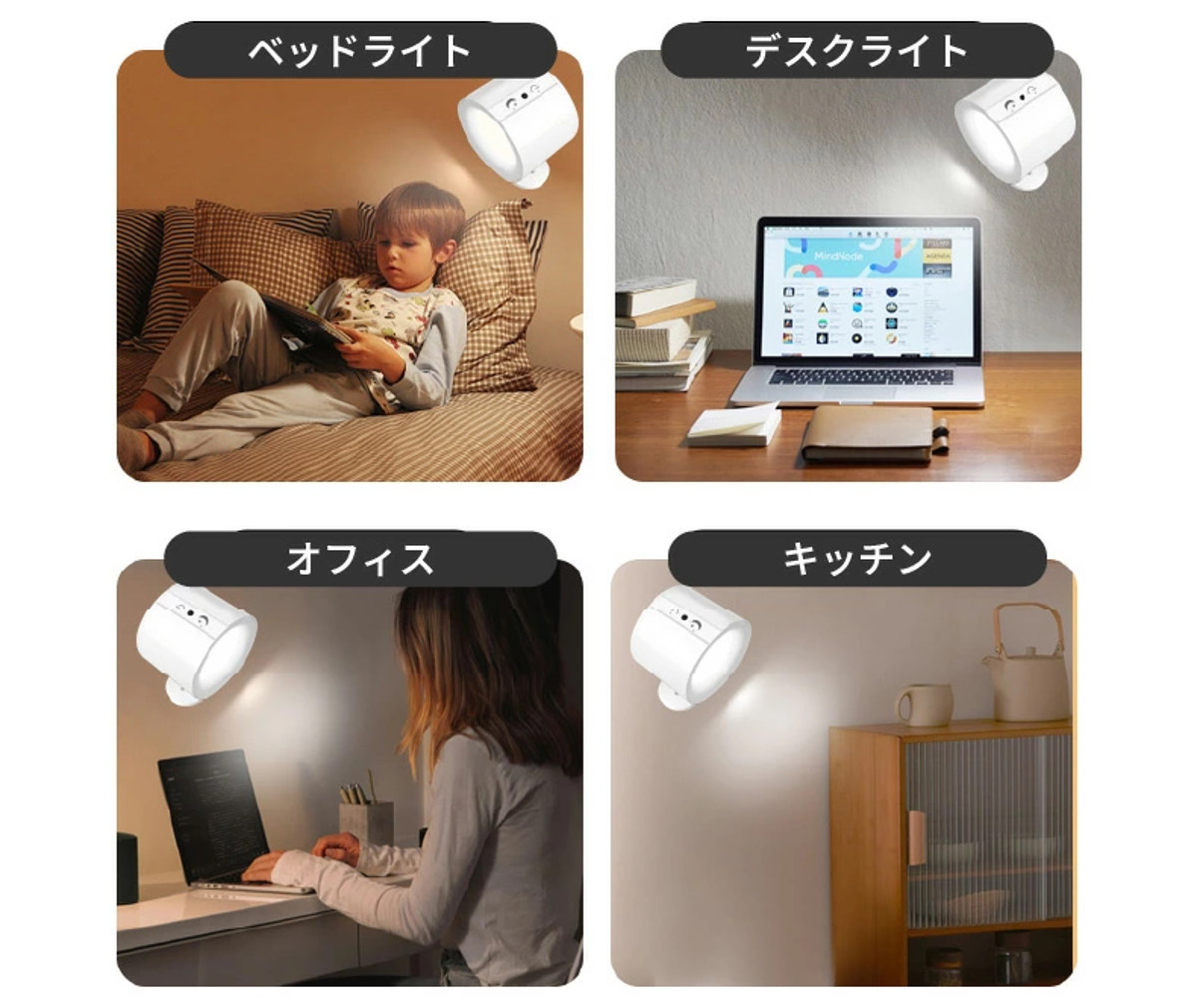 欲しいところに明かりをくれる壁に取り付けて使える便利なLEDライトです。デスクやベッドサイド、キッチンなど、もう少し明るさが欲しい場所の補助照明として活躍します。