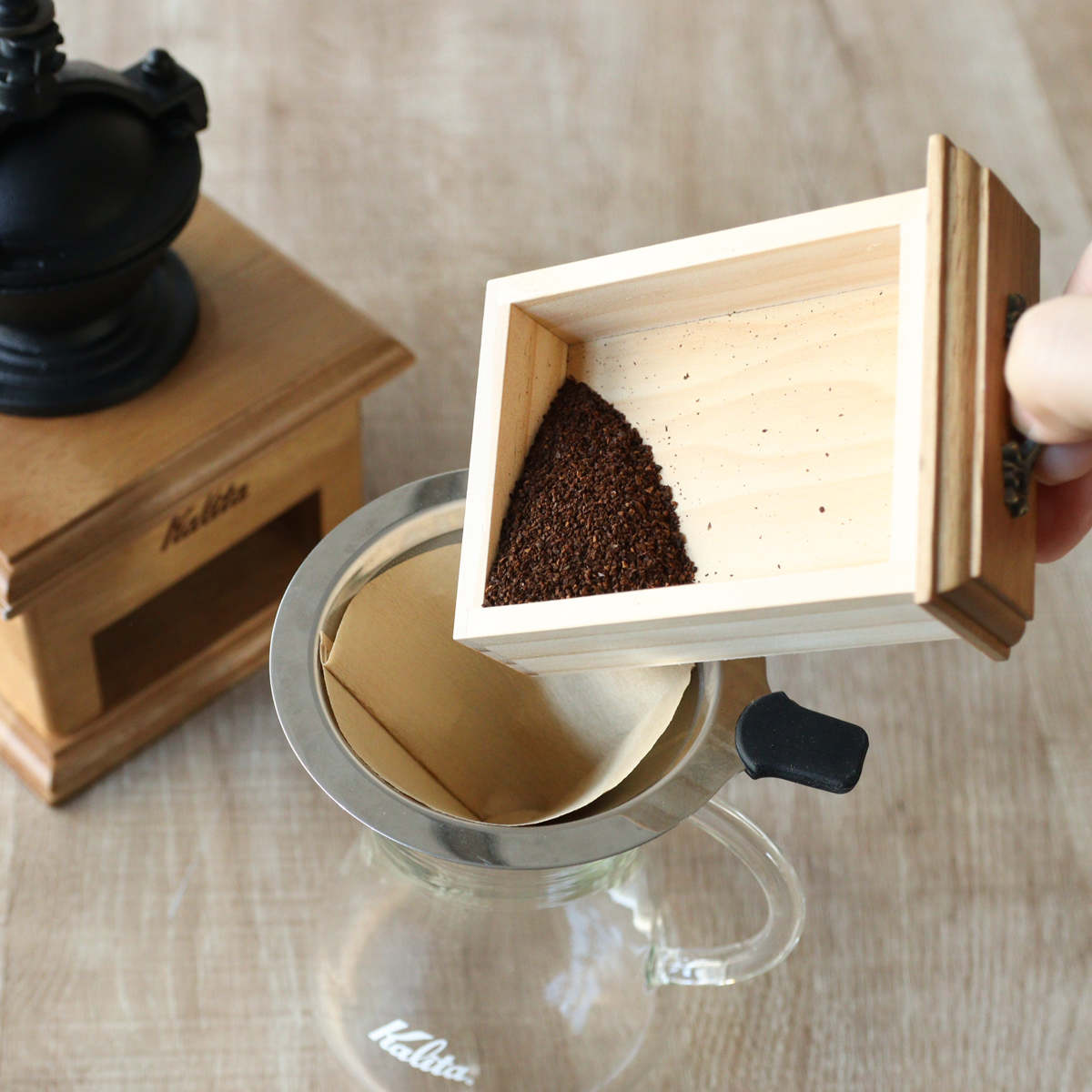 粉受けの引き出し部分にはカリタのロゴが刻まれ、持ち手にはアンティーク調の金具を採用。中にはマグネットが付いており、グラつきを防ぎ、粉こぼれを軽減してくれます。