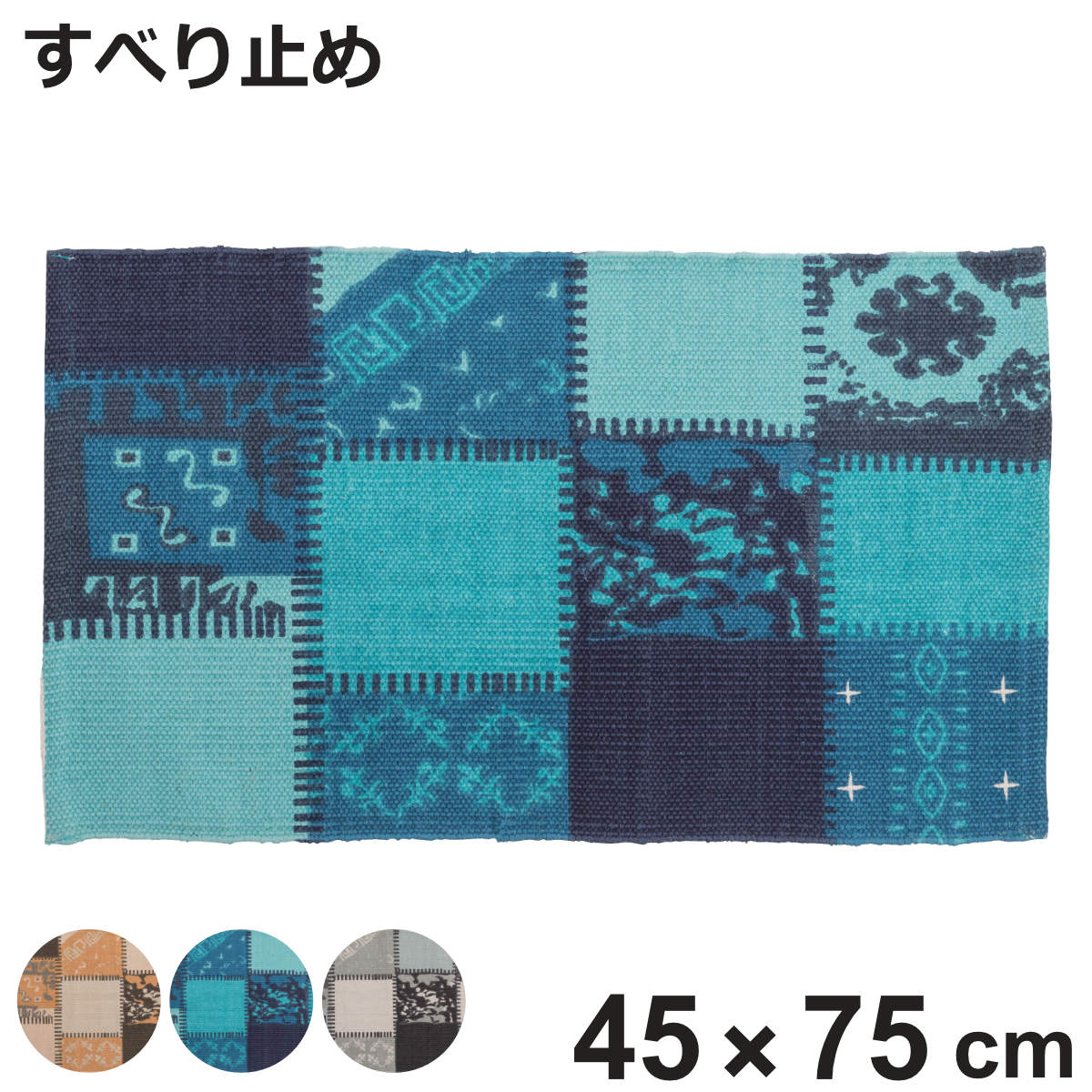 パッチワーク風のデザインが特徴のミニマット 45×75cm様々な柄をつなぎ合わせたパッチワークのようなデザインが特徴のミニマットです。玄関マットとしてはもちろん、ベッドサイドやソファ下などに敷くだけで、お部屋やインテリアに一味違うアクセントがプラスされます。