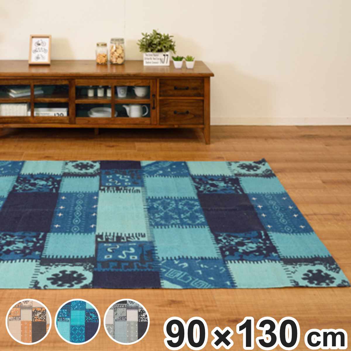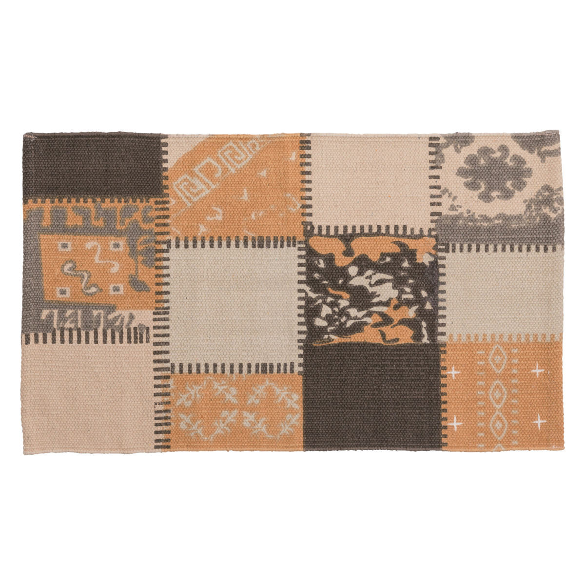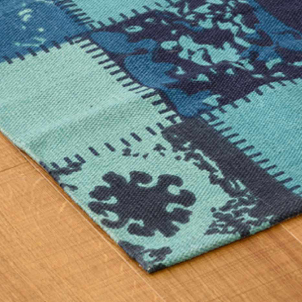 様々な柄をつなぎ合わせたパッチワーク風デザインのマット●さらっとした肌触りのインド製コットンのラグです。