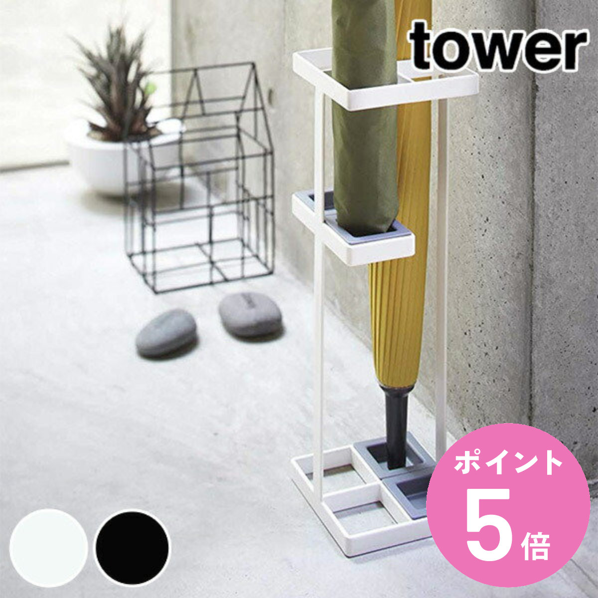 白、黒のモノトーンデザインがおしゃれな収納シリーズ「tower(タワー)」のアンブレラスタンドです。受け皿の位置を変えて、長傘も折り畳み傘も収納可能です。