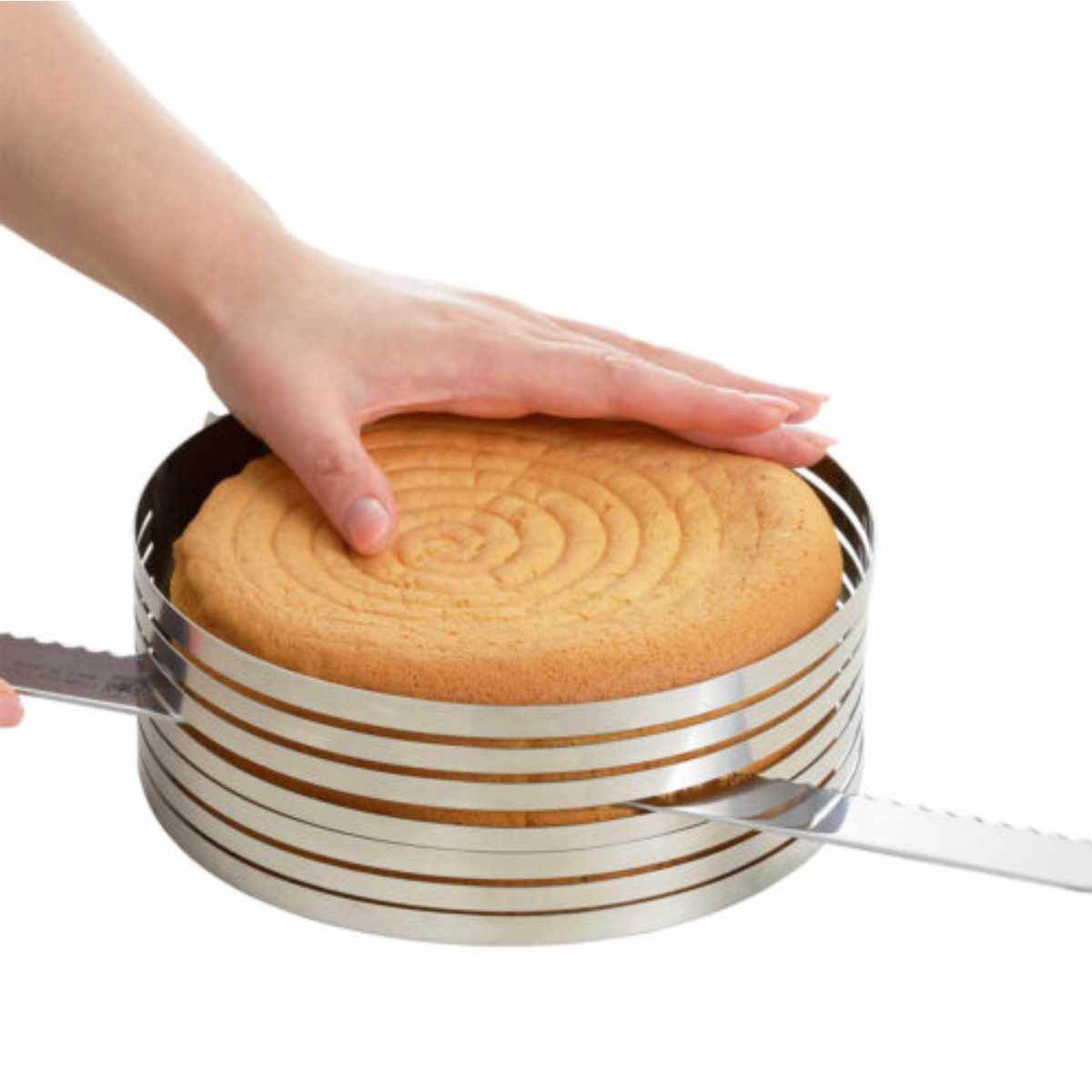 スポンジケーキを水平にスライスできるスポンジケーキを水平にスライスできるケーキスライサーです。複数枚スライスする事ができ、ケーキの断面も美しく仕上がります。幅は約20cmなので、15cm・18cmのケーキに対応しています。