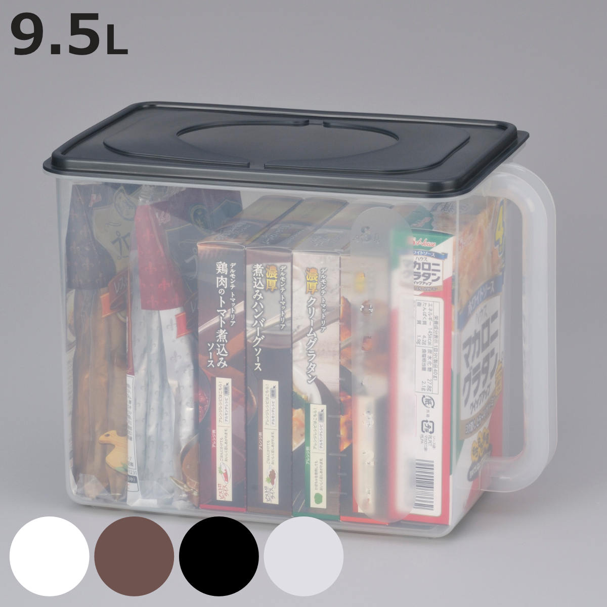 買い置き収納に便利な取っ手付きストッカー食品や日用消耗品などの買い置き収納に便利な深型タイプの取っ手付きストッカーです。フタ付きなので、虫の侵入やほこりを防いでくれ、食品も安心して収納することができます。最大容量9.5Lなので、大きな袋も楽々収納できます。