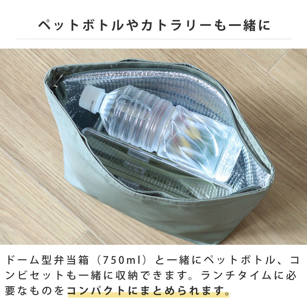 ●ランチタイムに必要なカトラリーセット、ペットボトルも一緒に収納できます。