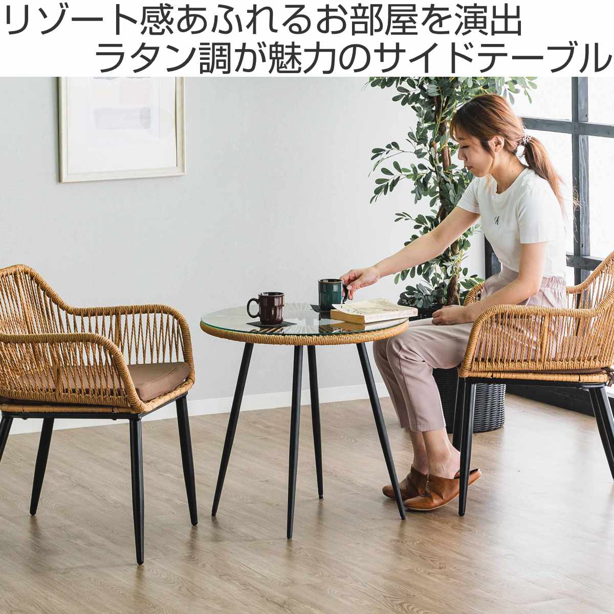 人工ラタンとガラス、ブラックスチールの組み合わせが絶妙なサイドテーブルです。ラタン調のデザインが置くだけでリゾート感を演出。ゆったりとした癒しのひとときをお過ごしいただけます。天板のガラスが涼しさと抜け感を生み、スリムなスチール脚がすっきりとした印象を与えるため、圧迫感が少なく、お部屋も広々と感じられます。