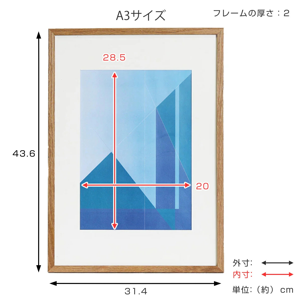 | サイズ | 約 幅31.4×高さ43.6(cm) 厚さ:約 2(cm) ラベルサイズ:A3 マット内枠 約20×28.5(cm) |