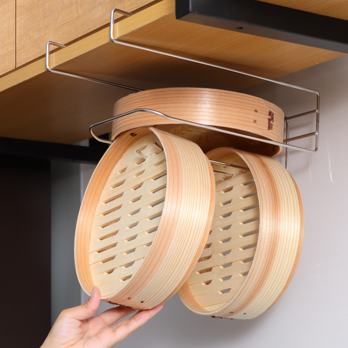 しっかり乾かさないとカビや黒ずみの原因になってしまうせいろをスッキリ乾かせる吊戸棚ラックです。使用後のせいろをそのまま掛けて干しながら保管ができるので、収納場所に困らずキッチン周りを整えることができます。