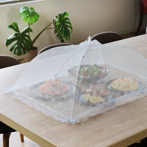 帰りの遅いご家族のご飯やお菓子を保管をしておくのに便利なフードカバーです。傘のような構造になっており、ぱっと開いてかぶせるだけで料理をほこりや虫から守ることができます。レース状になっており通気性もあるので、作ったお弁当やお菓子などを冷ましておくときにも活躍してくれます。