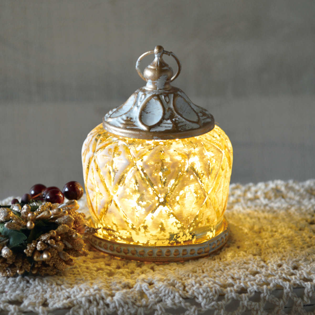アンティークの輝きで、空間をクラシカルに演出●小さなサイズでも存在感のある、アンティーク調のLEDランタン型インテリアライトです。