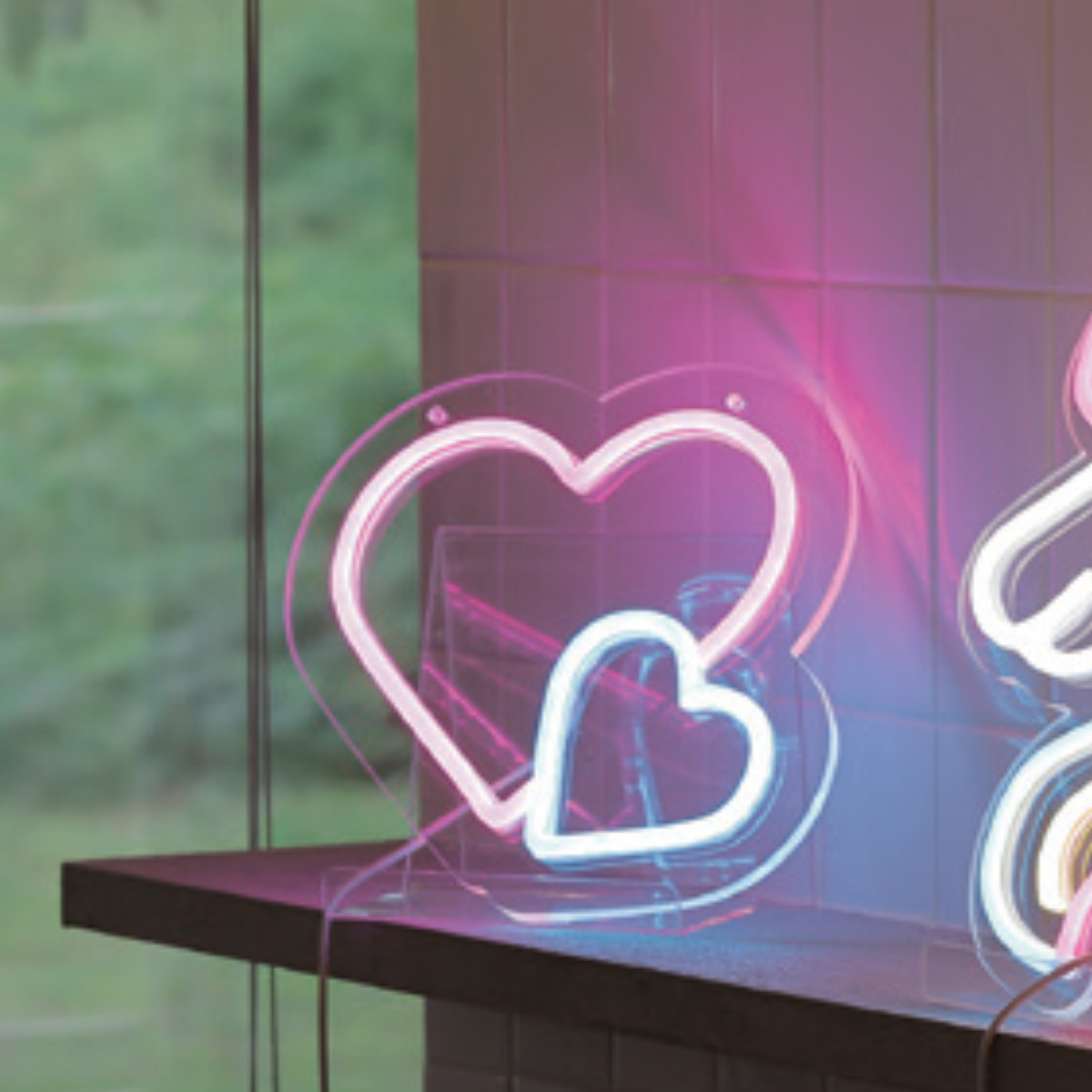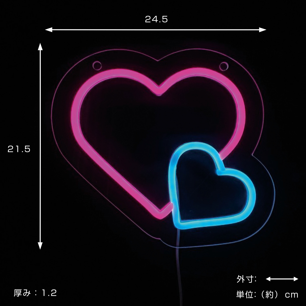ネオニーサインライト -Hearts-アクリル板にLEDチューブライトを組み合わせた個性あふれるデコレーションライトです。ネオンのようなカラフルな光を放ち、インテリアをおしゃれに彩ります。リビングや寝室、店舗など幅広い場所でお使いいただけます。