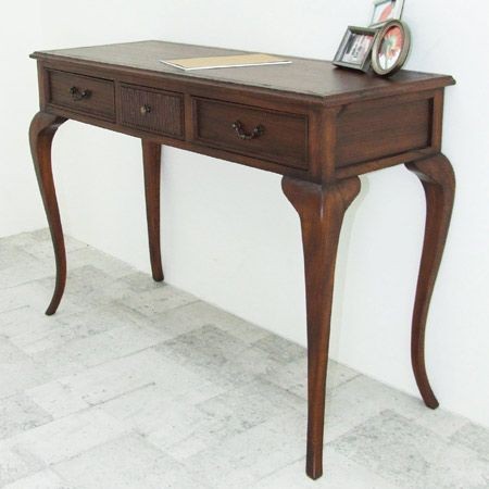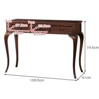 ●英国のアンティーク調デザイン。●アンティーク好きな方に定番人気のネコ脚。●取っ手もまるで本当のアンティークのよう。●天板の角が美しくデザインされています。繊細で優雅な雰囲気に。●ミンディの特長は木目が美しい事。高級家具や楽器、彫刻材として使用される木材です。●リビングや玄関などでコンソールとして使用したり、寝室でドレッサー用に使用したり、様々なシーンで使用出来るテーブルです。●両サイド、中央共、小物を収納出来る引出し。【商品詳細】サイズ:約 幅106.5×奥行41×高さ74.5cm、重量:約16kg 内容量:1台 材質:天然木、ラッカー塗装 カラー:ブラウン 備考:完成品《コンソールテーブル 机 送料無料 》