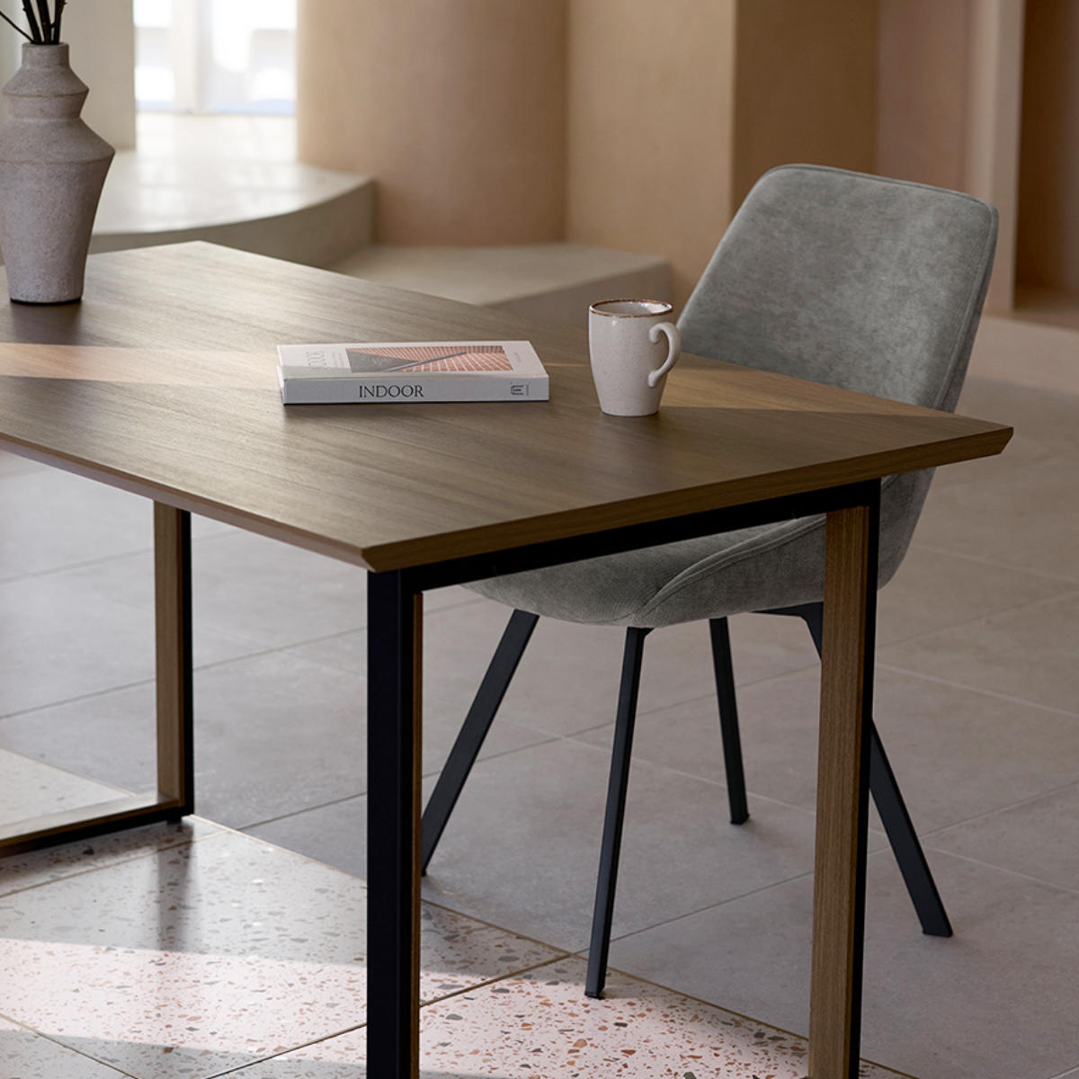 マットなブラックスチール脚が全体を引き締め、モダンでスタイリッシュな印象に。耐荷重は約80kg、耐久性に優れた粉体塗装仕上げで、水や汚れにも強く、美しい状態を長く保ちます。