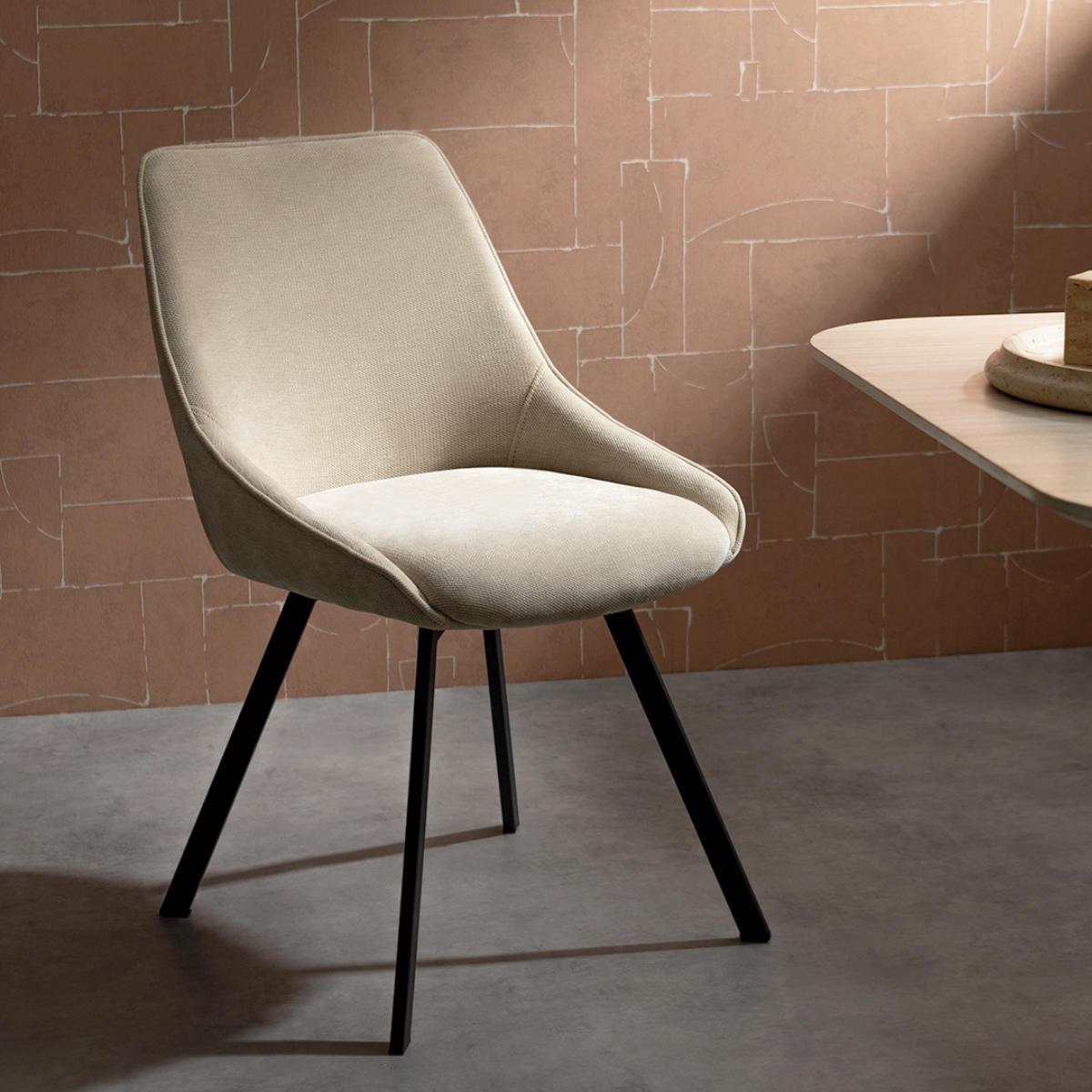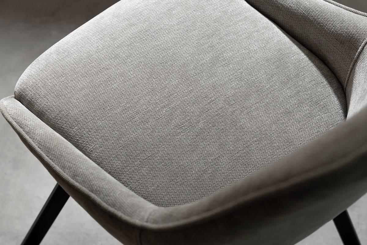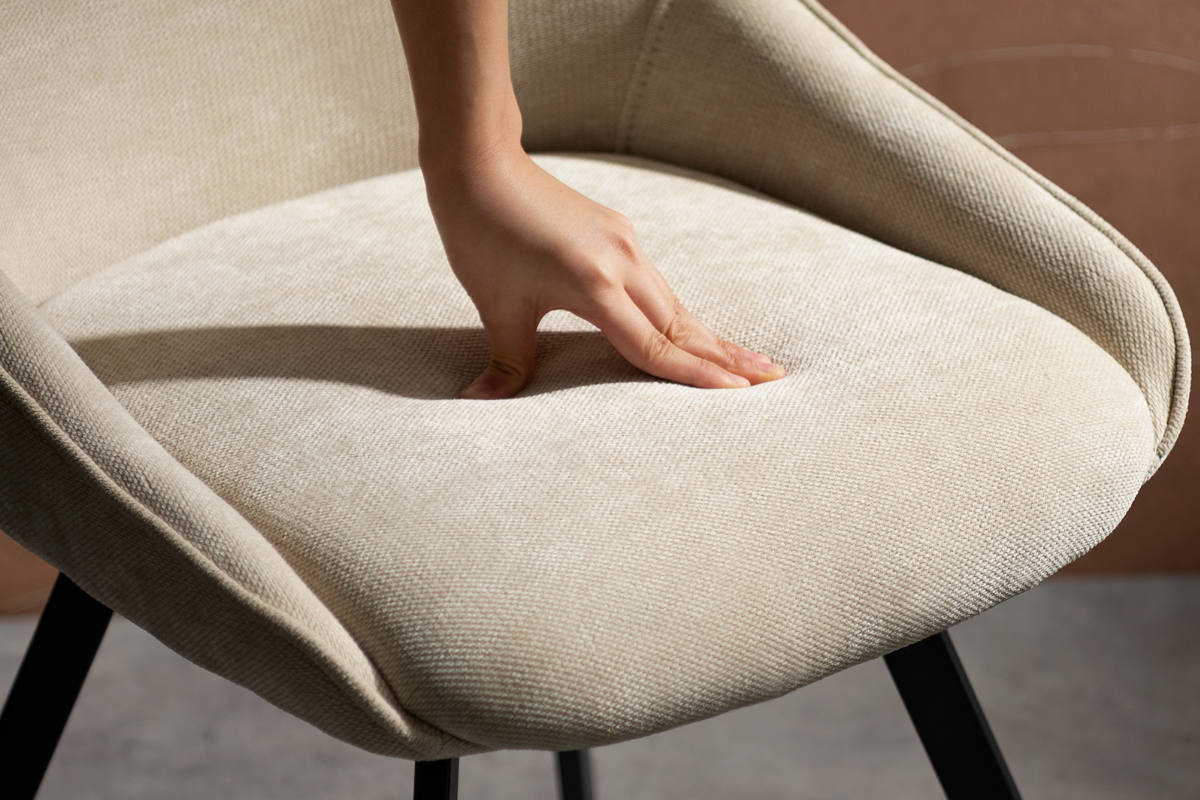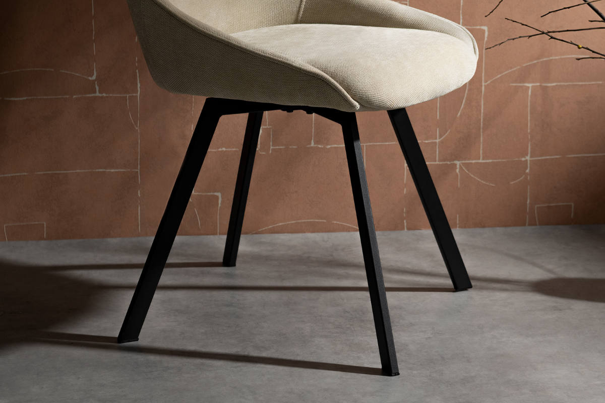 柔らかな曲線が魅力の回転式ダイニングチェア「Hurst(ハースト)」。さらりとしたファブリックとマットなブラックスチールの組み合わせが、上品で洗練された印象を与えます。モダンでスタイリッシュな空間にも美しく調和し、上質な雰囲気を演出します。