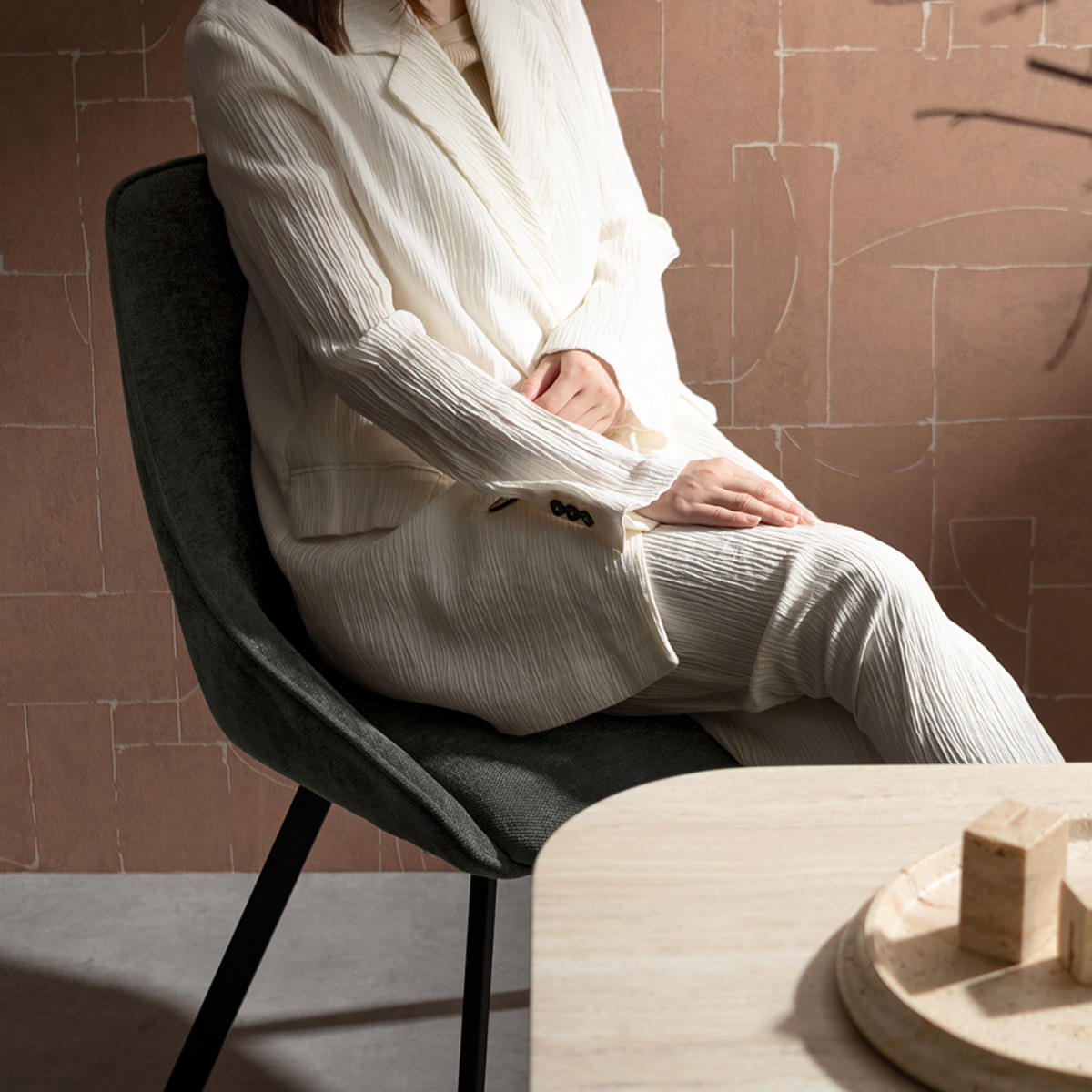 広めの座面と一体化した背もたれが、身体をやさしく包み込みます。長時間座っても疲れにくく、食事や会話を心地よく楽しめる快適な座り心地です。