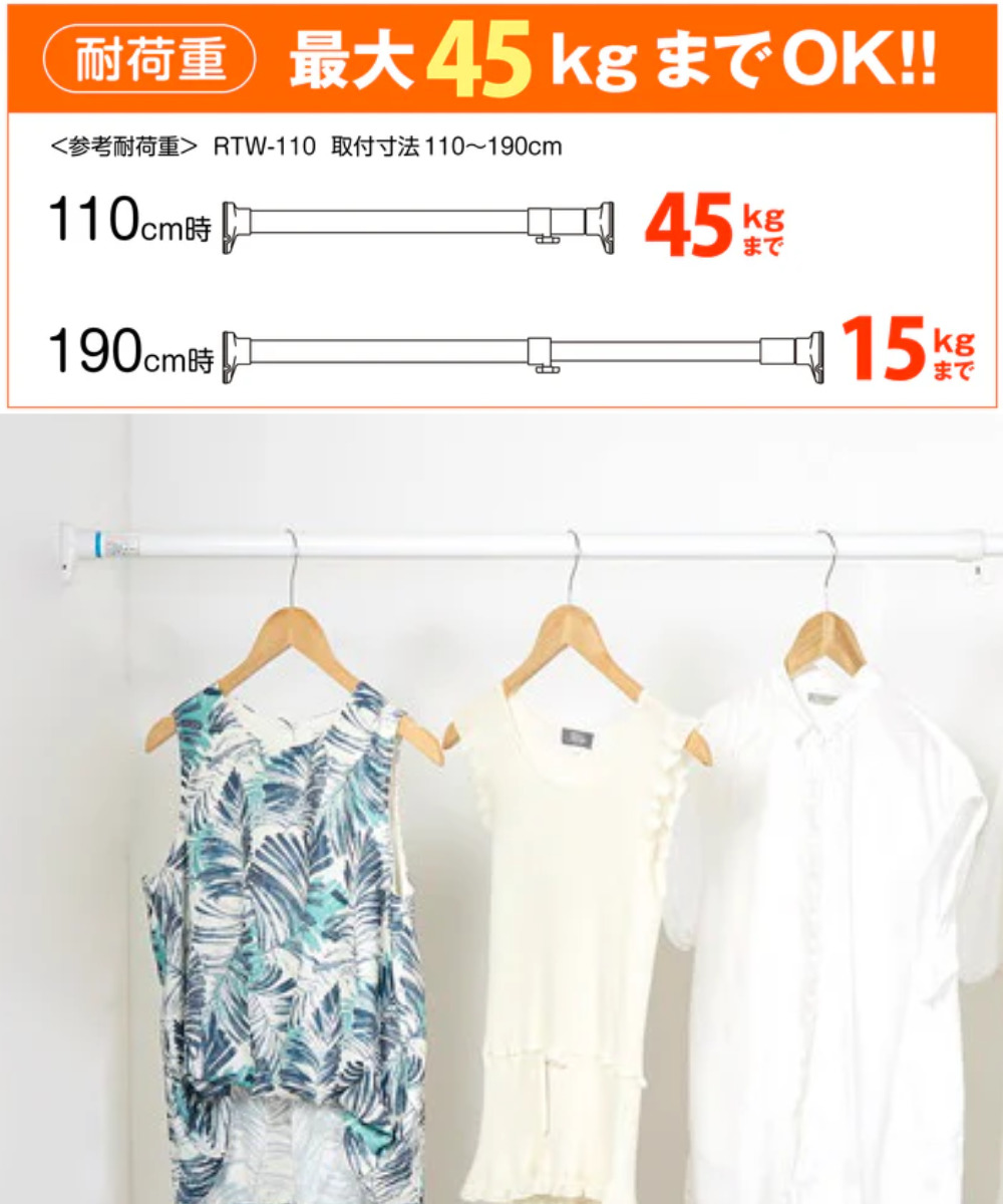 | 注意事項 | ※石膏ボード、砂壁、内部に空洞のある壁などには取付けないでください。 ※壁の距離、壁の状態、つっぱり方により耐荷重は変化します。 |