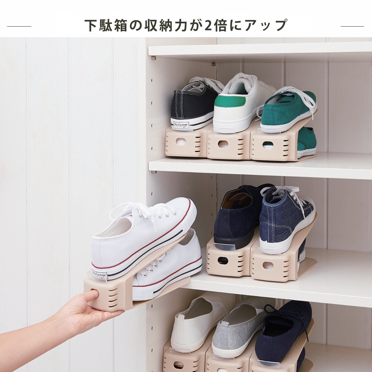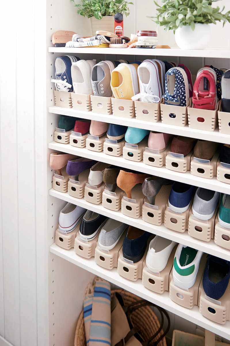 靴の収納量を2倍に増やすことができる、くつホルダーです。1足分のスペースに2足を収納できるため、下駄箱や玄関のスペースを有効活用できます。「靴が多くて下駄箱に入りきらない!」「玄関にたくさんの靴を出しっぱなしにしている」という方にオススメです。