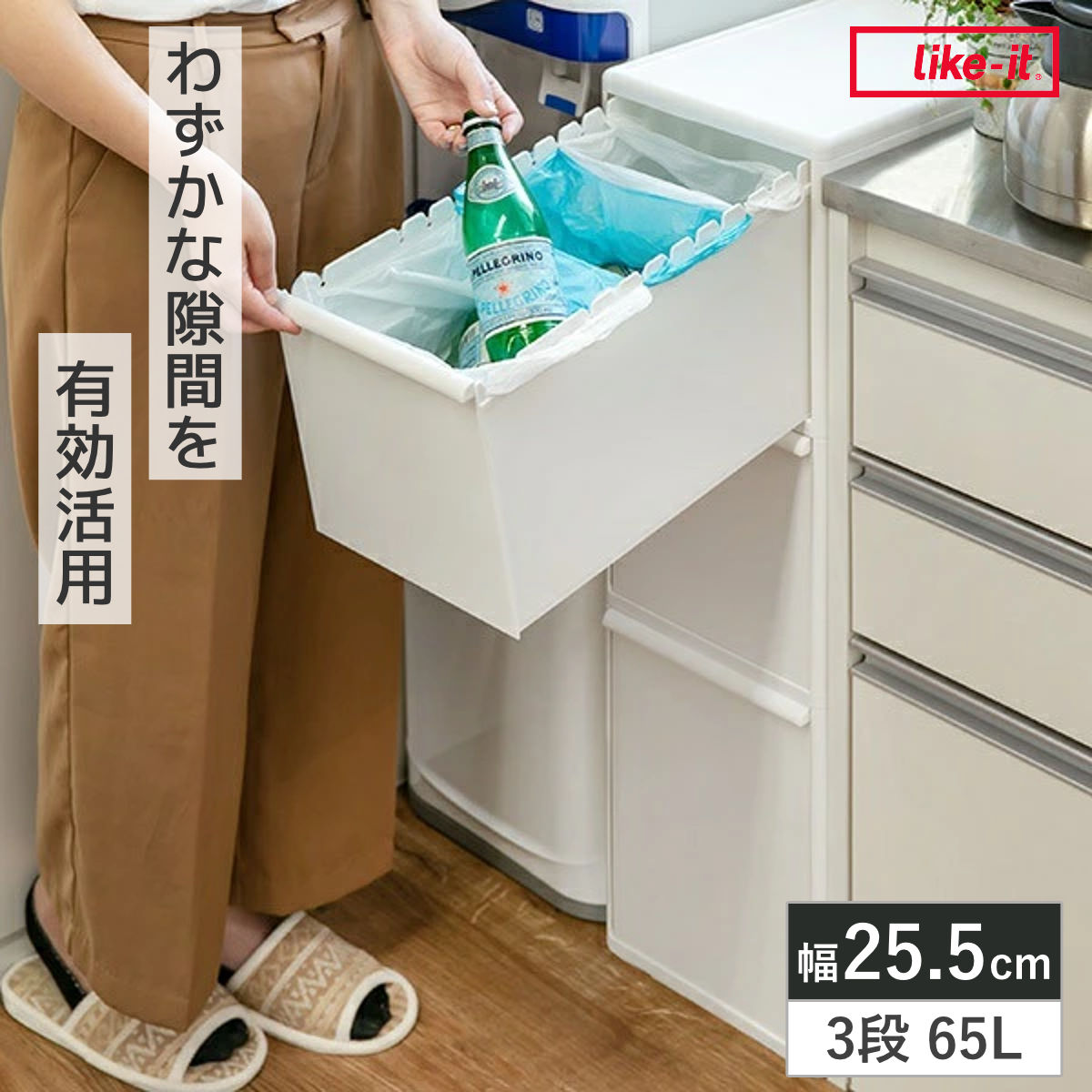 冷蔵庫や食器棚の横にあるちょっとした隙間にも収まる幅25.5cmのゴミ箱です。縦型のゴミ箱なので、キッチンのデッドスペースを有効活用して、1台でしっかり分別ができます。