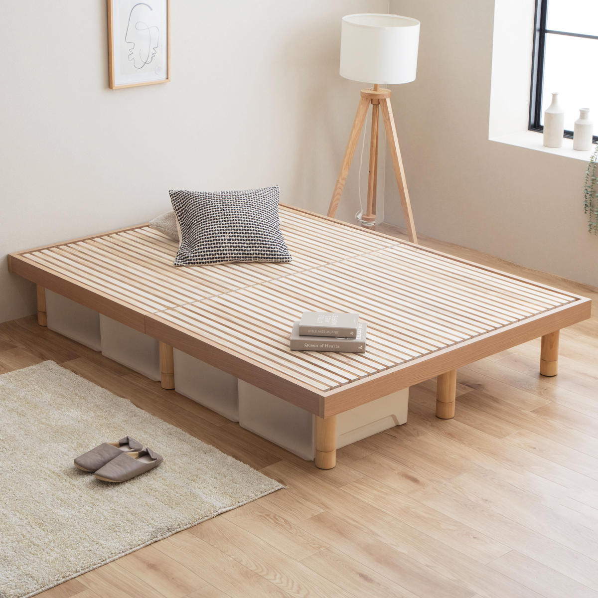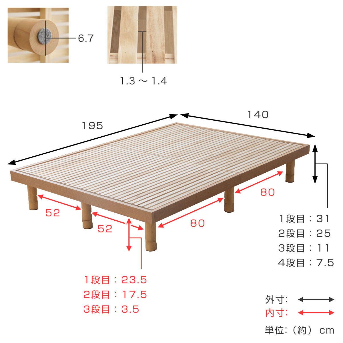 | サイズ | 約 横140×縦195(cm) 高さ:31・25・11・7.5cm 床板有効寸法:幅140cm×長さ195cm 床面高さ:31・25・11・7.5cm ベッド下間口:23.5・17.5・3.5cm |