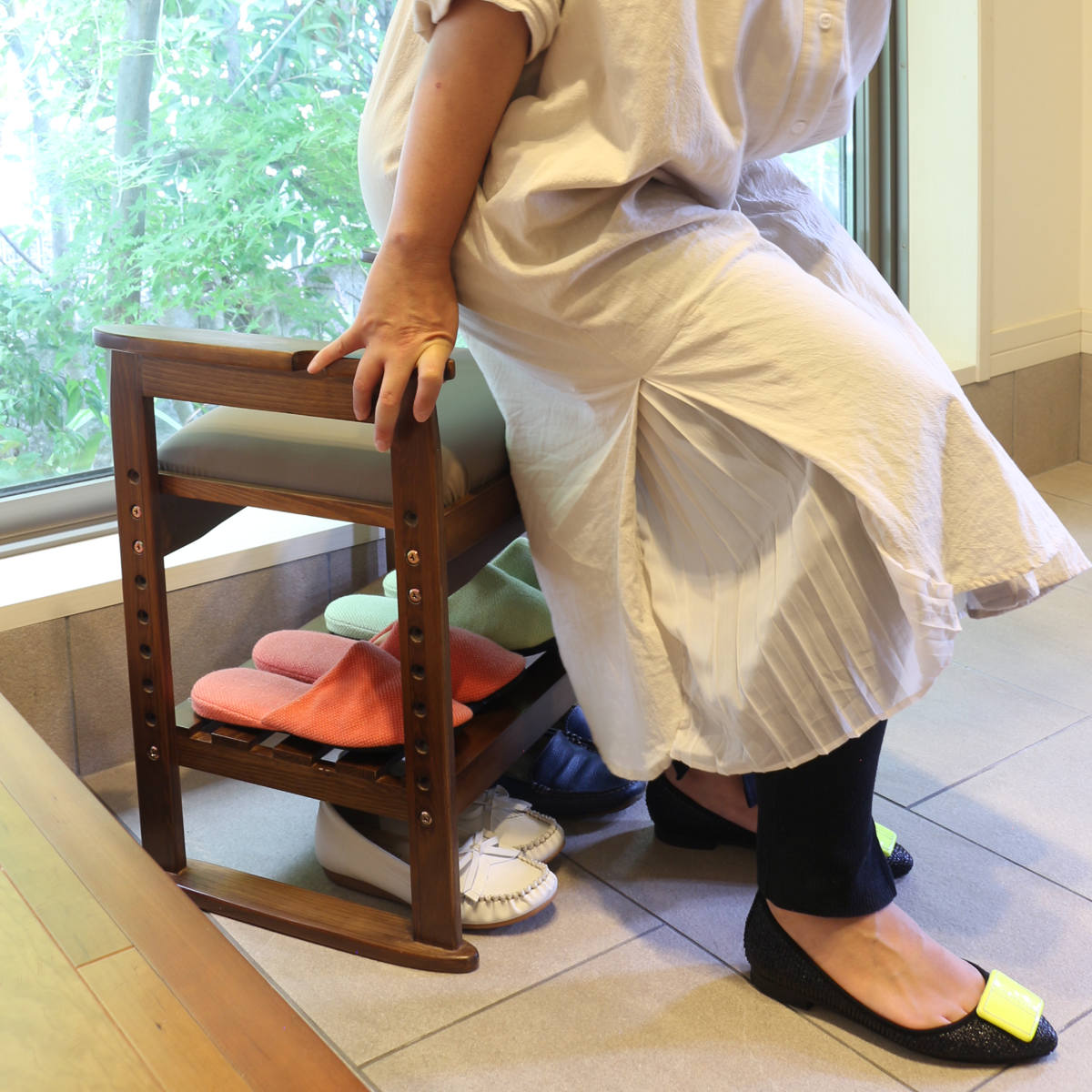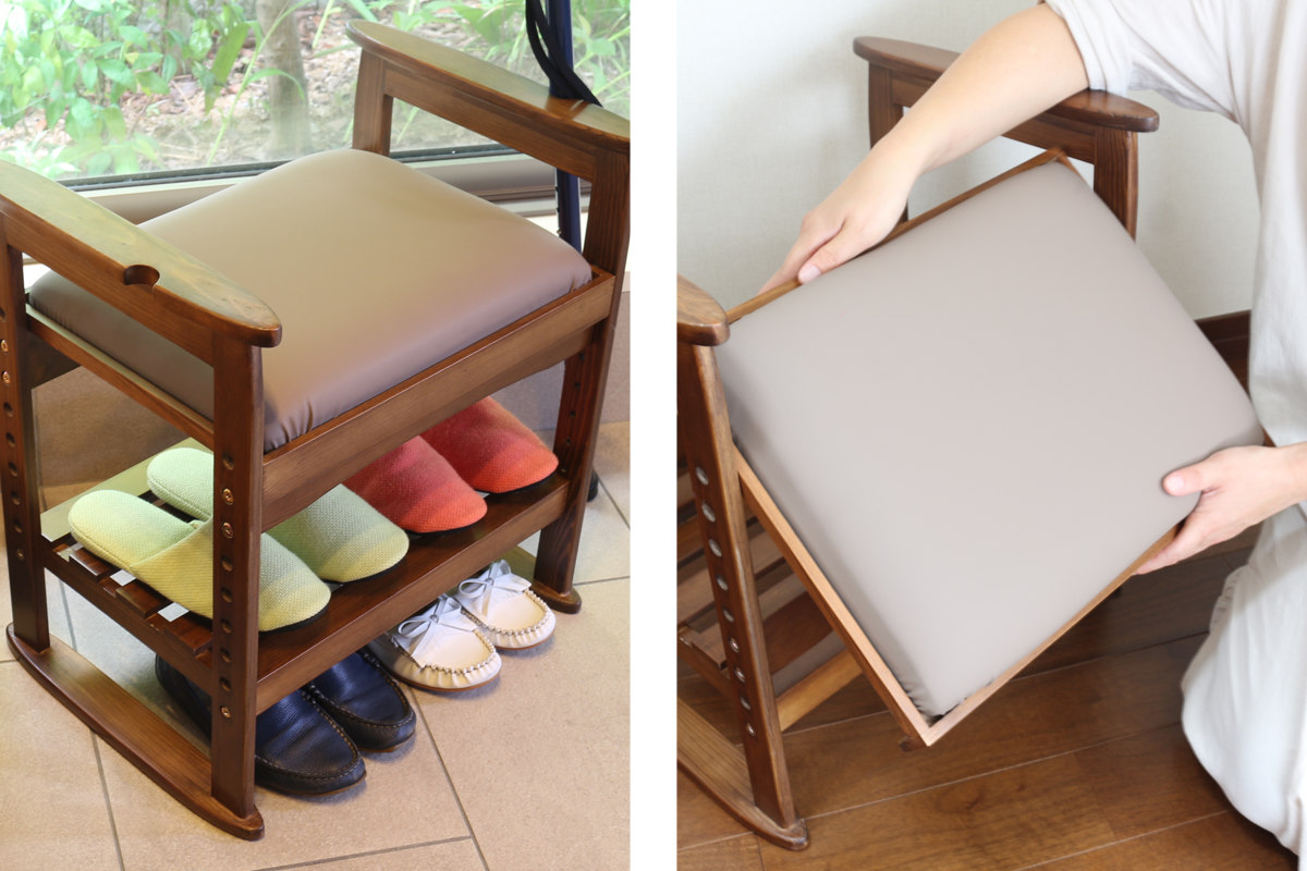 | 収納棚付き 脱いだ靴やスリッパなどの収納に便利です。 | 座面取り外しOK 座面が汚れた時はサッと取り外して拭き掃除ができます。 |