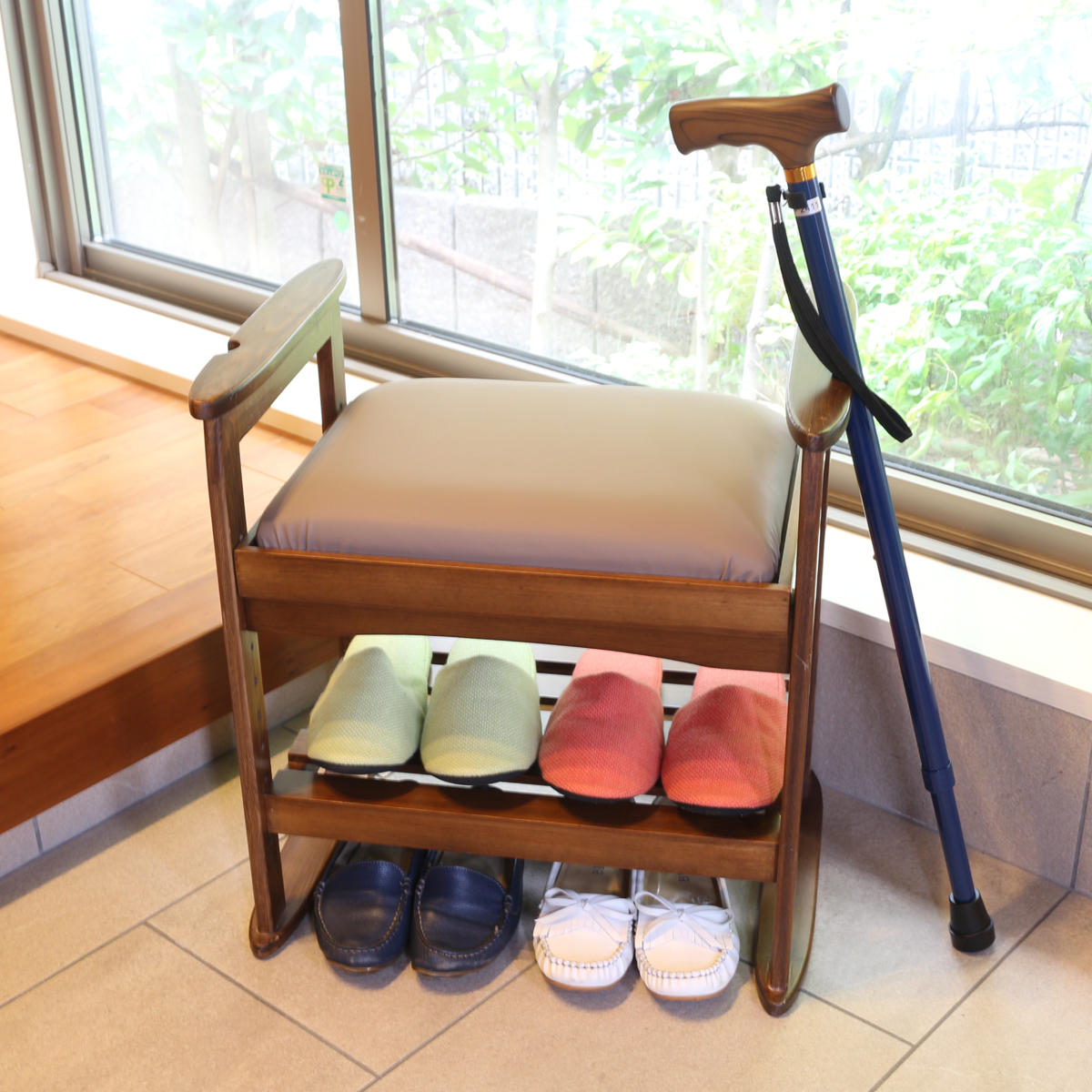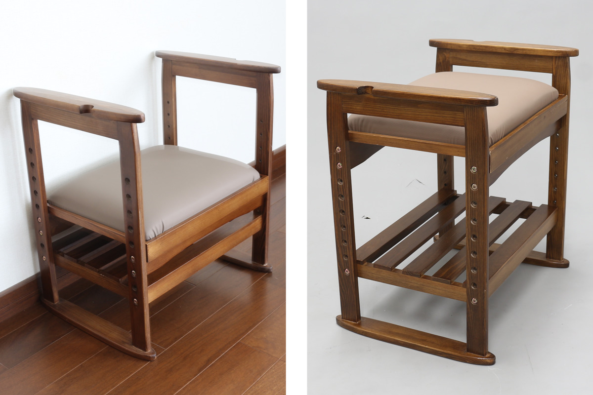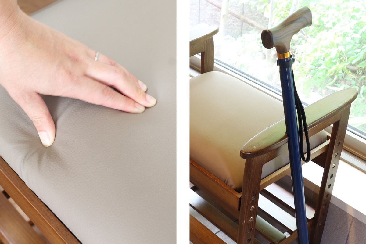 | 弾力のある座面 座面には適度な弾力があるため、お尻が痛くなりにくいです。 | 杖や傘は定位置に 両サイドの取っ手には、杖や傘を立て掛けるのに便利な凹みが施されています。 |