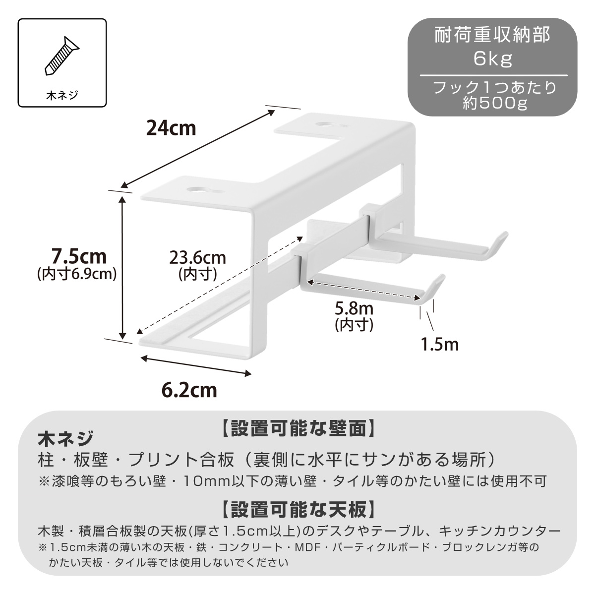 | 耐荷重 | 収納部:6kg フック1つあたり:500g(静止荷重) |