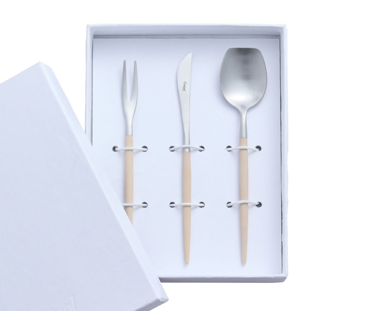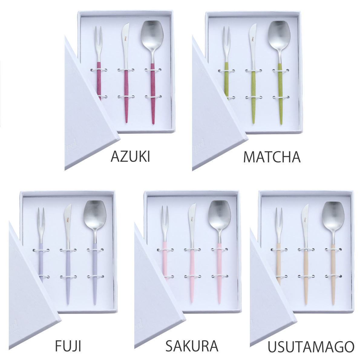食卓を彩るカトラリー3本セットクチポールの和菓子専用のカトラリーセットです。クチポールのシャープで特徴的なナイフの形状をそのまま生かした菓子切り、先端が平らで容器の底をすくいやすいアイスクリームスプーン、繊細な和菓子も楽しめるようにデザインされたフォークの3本セットで贅沢なひとときを。