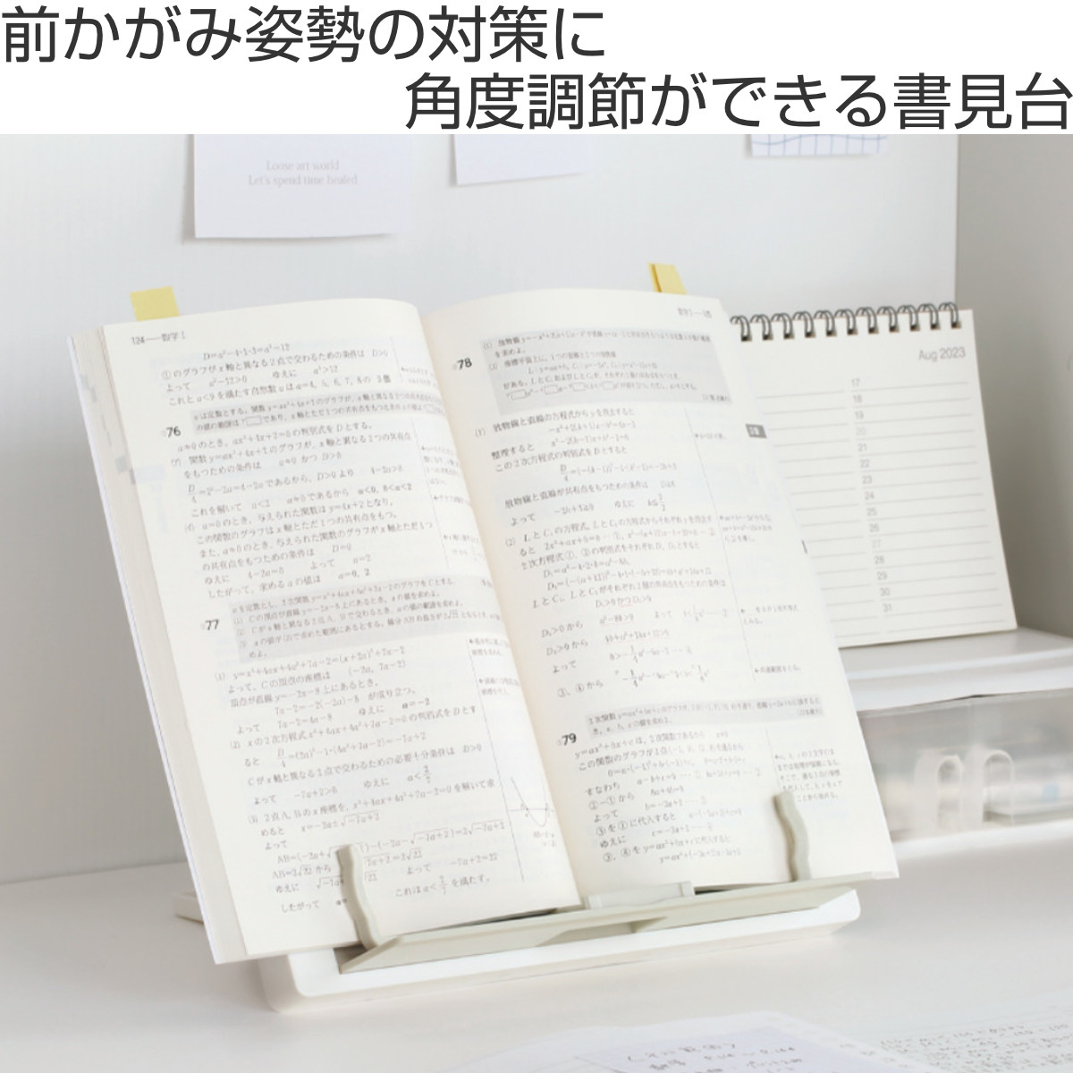 6段階の角度調節ができる書見台です。目線が上がるので、ついついなりがちな前かがみ姿勢対策にぴったりです。