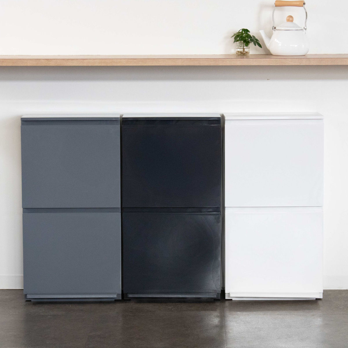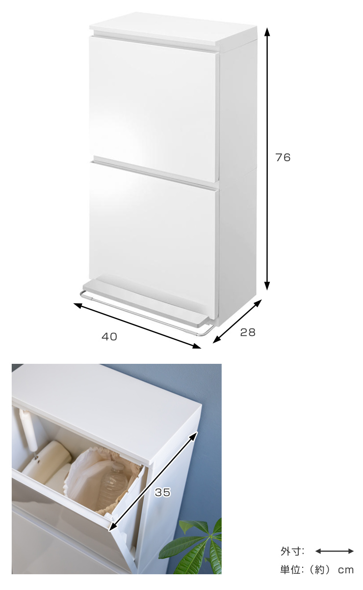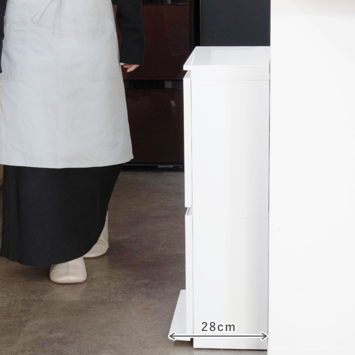 動線の邪魔をしない奥行約28cmのスリムゴミ箱奥行約28cmの薄型設計で、キッチンの通路や壁際、冷蔵庫横など幅の限られたスペースにもすっきり設置できるスリムゴミ箱です。40L(20L+20L)の容量を確保しながらも圧迫感がなく、毎日の動線を妨げずに快適なキッチン空間を保てます。